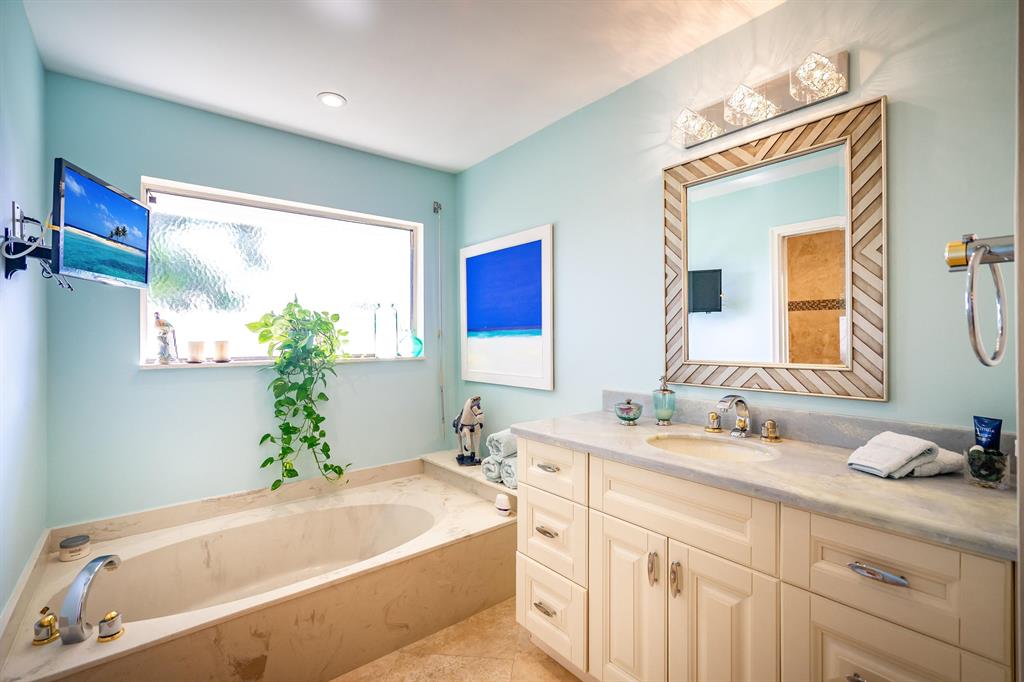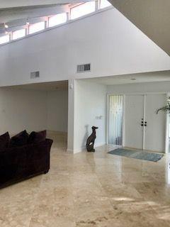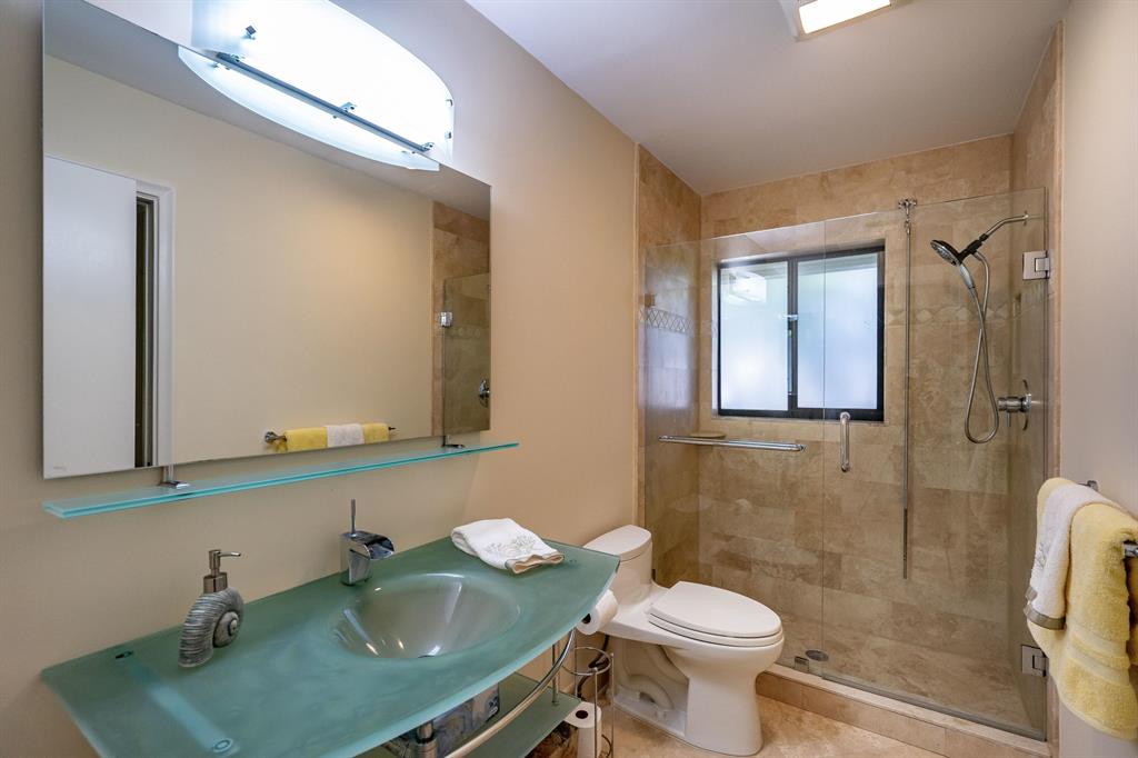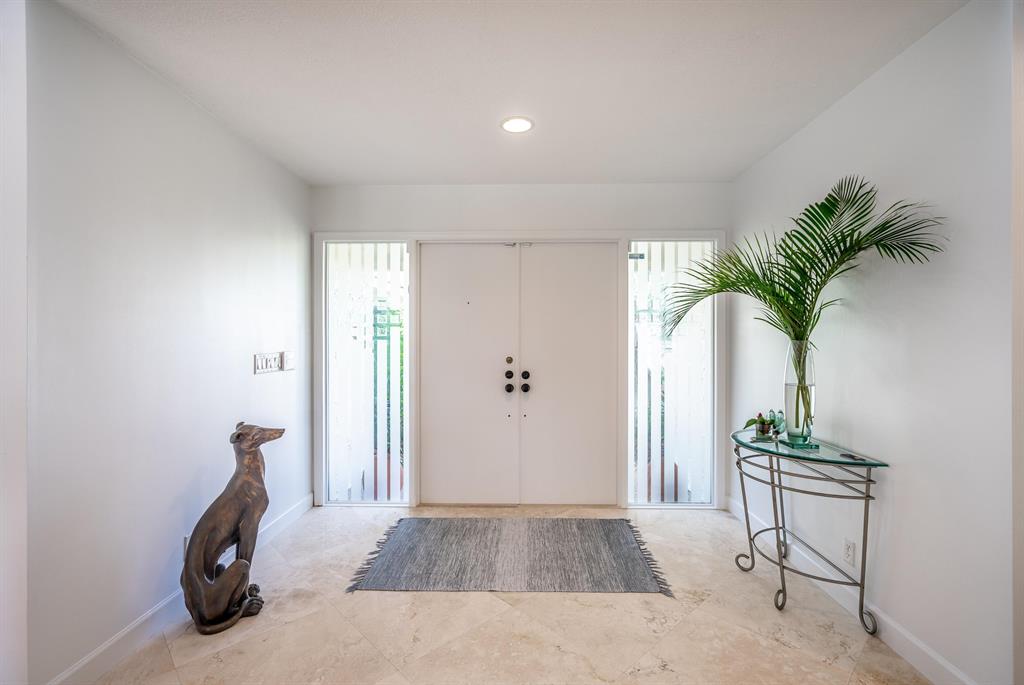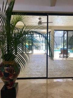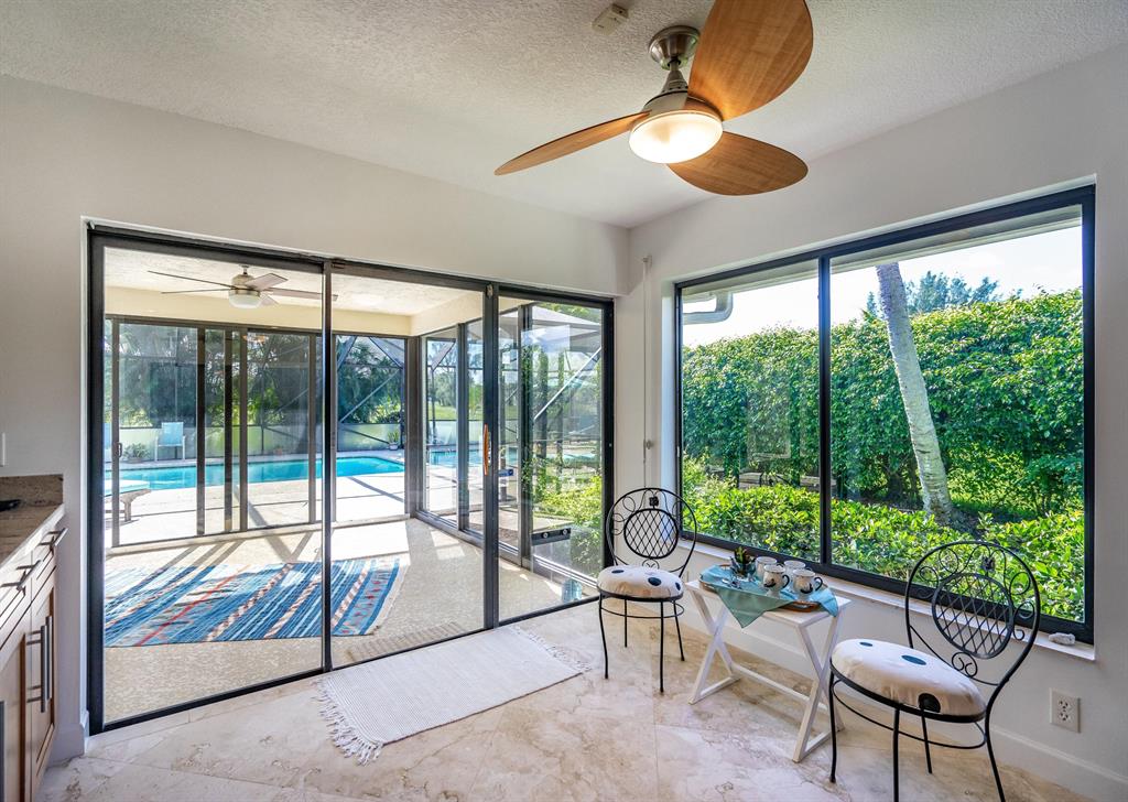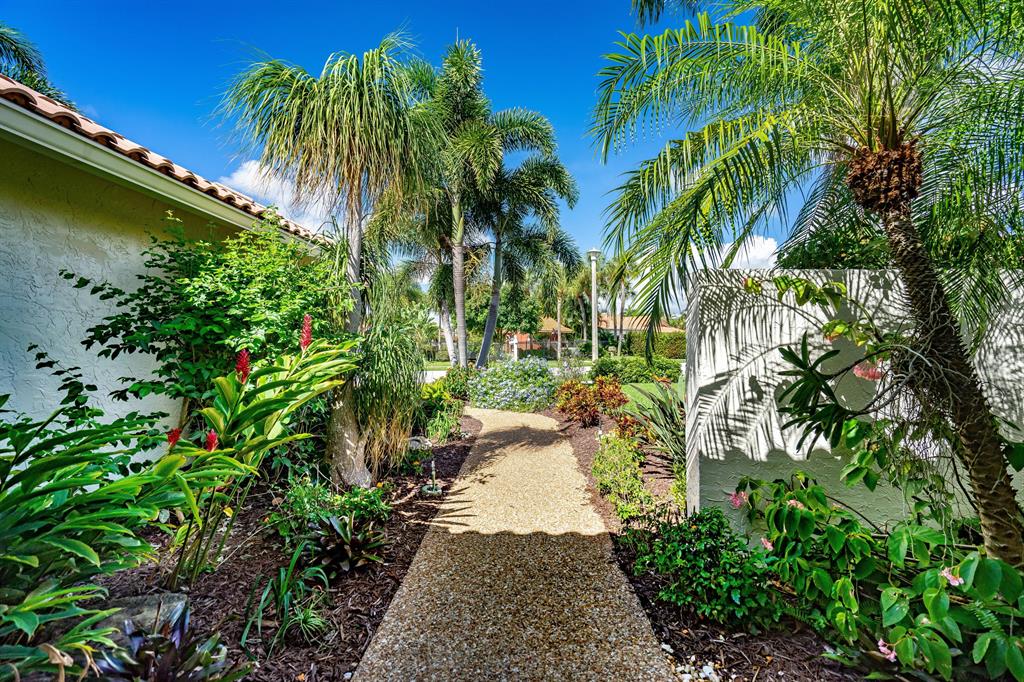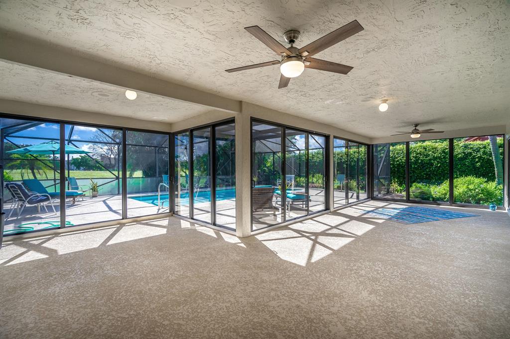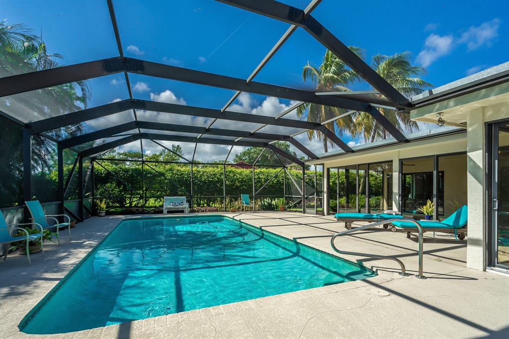 Prime location in East Boca Raton, backing up to what will be the new ''Boca National Golf Course''. Contemporary design interior, mature trees - Mango, coconuts and Royal palms, privacy hedges and professionally landscaped beds and yard. Custom kitchen features wood cabinetry with granite and bar and breakfast bars. Living room soars with 2-story high beams and clerestory lights for natural light. Travertine floors throughout and 2 BRs have beautiful bamboo wood. Pool is fully screened plus with special bracing and has child fencing included. Home boasts solar hot water and passive solar for pool. Home is freshly painted inside and out. Master bath has pocket doors for privacy and has custom closet. Living space continues into a 600 sf Florida Room/lanai