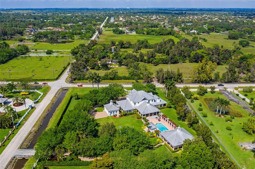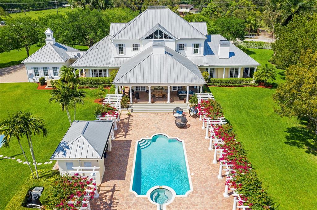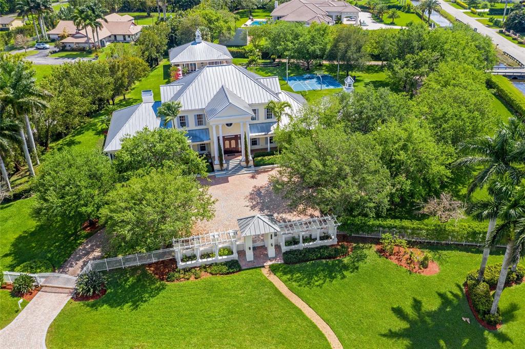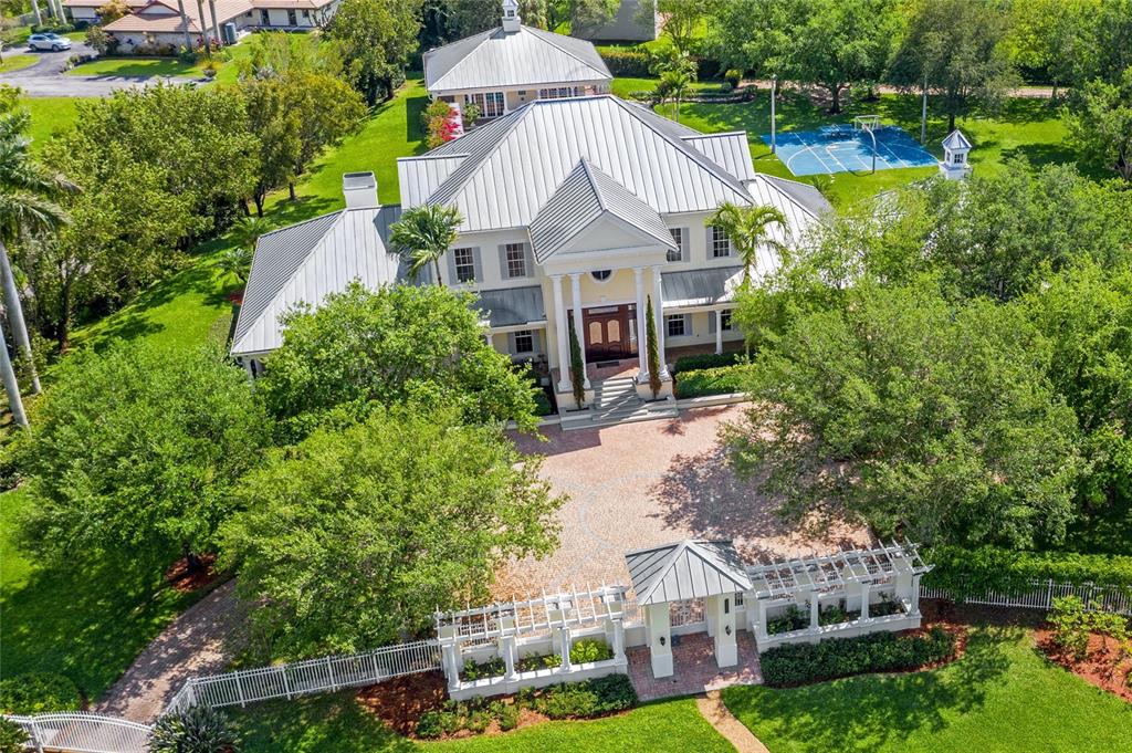 Stunning Sunshine Ranches gated compound on extensively landscaped corner acreage. Timeless Key West style w/metal roof & wrap around porches. Featuring a hotel style courtyard pool & fountain, summer kitchen, sport court & detached poolside guest house Casita. Stately living areas w rich details, built-ins, mahogany & marble floors. Elegant Chef's kitchen w center island, commercial grade stove & hood, chilled wine closet & morning dining room. Downstairs Master Suite and bath + guest suite off kitchen. Upstairs game room, 3 bedrooms each w full baths. Family room w fireplace & horseshoe bar overlooks the pool courtyard. Interior fountain gathering area off kitchen & family room offers a unique setting w adjacent library/den. Winding live oak drive w 2 entry points & detached garage.