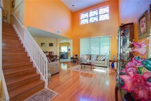 Spacious 4 bedrooms 3 bath with high soaring ceilings and lots of light is located in sought after Laguna Springs section of Country Club Village. Home has a bedroom and full bathroom on the ground floor for added privacy. Conveniently located close to restaurants, shopping, major highways. Recently installed accordion shutters upstairs for your convenience, newer A/C unit with energy saving features.
