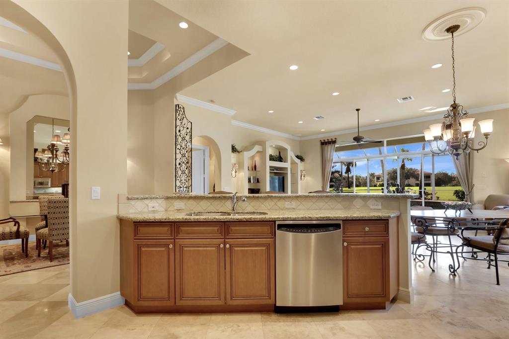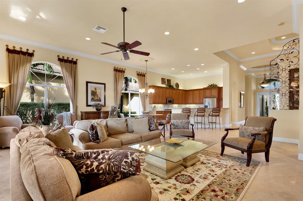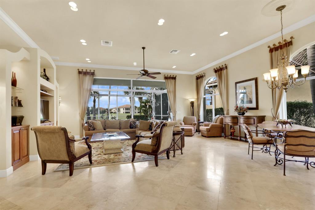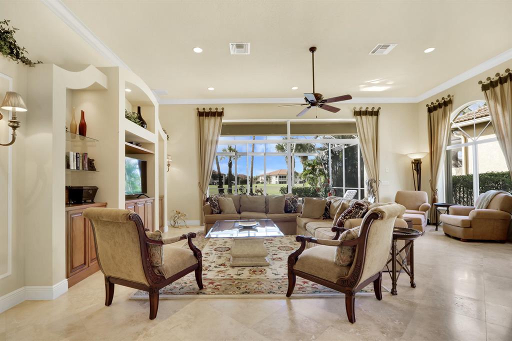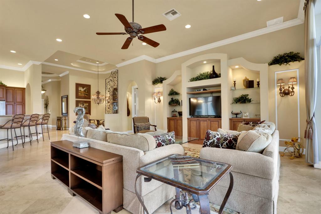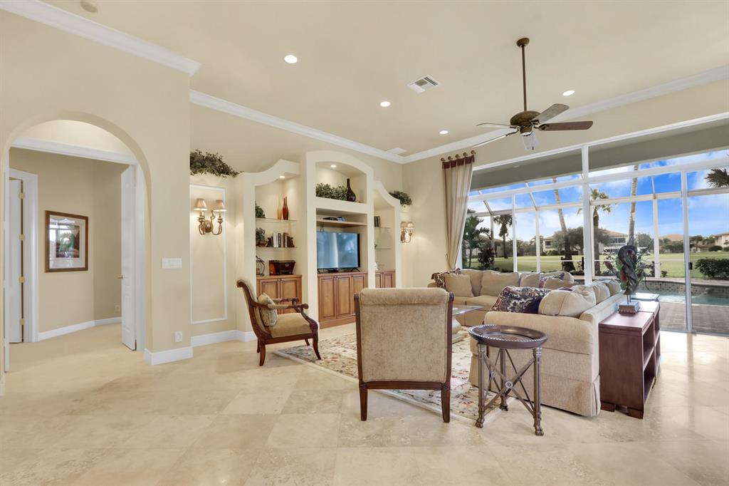 Stunning builder's model home set on an oversized lot. This expanded ''Riviera'' model boasts 3BR/BA+Den+ a Bonus room. There are more than $100,000 in upgrades in this home both from original and subsequent upgrades. Stunning marble floors with a an elegant medallion at the entry. Custom built-ins, designer window treatments and light fixtures along with elegant crown moldings and designer accents throughout. Accordian shutters, large screened Lanai, over-sized pool with lion fountains, NEW AC, NEW refrigerator, NEW pool heater and pump, NEW washer/dryer, Extra high hats throughout. ALSO OFFERED TURNKEY AND THAT PRICE would include golf cart with NEW batteries , NEW garage openers, NEW TV's, dishes, pots, silverware, kitchen appliances, outdoor furniture, designer