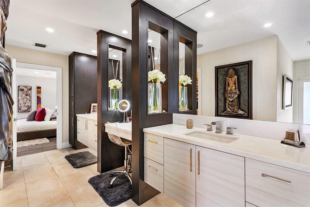 Situated on the most desired canal with ocean access in Camino Gardens, this spectacular home has been modernized throughout with rich finishes and amenities. This waterfront beauty is perfectly sized and features Thermador kitchen appliances with 6 burner gas stove, oversized center island with extra prep sink and white quartz countertops. The owner's suite is FIERCE with a large custom walk-in closet with island, spa bath has floating vanities, accent lighting, big shower with huge rainhead and Jerusalem tile flooring. The rest of the home has wide planked wood-look porcelain tile flooring for a modern coastal vibe. Immerse yourself in sound from the recessed Bose speaker system indoors and out. Enjoy the heated salt pool, LED landscape lights and private dock with electric & water...