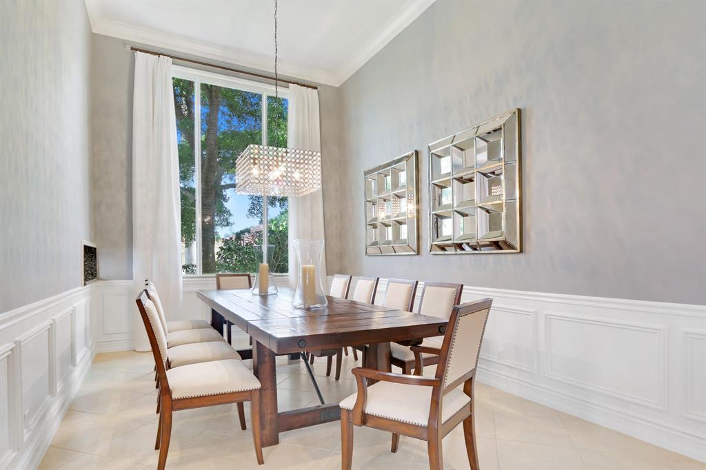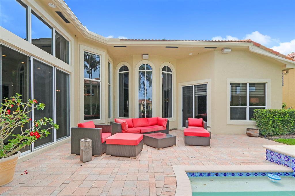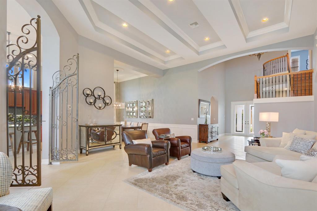 With 150 feet of water frontage, this former builder's model is located on a premium, wraparound water lot in desirable Tradition Cove. Upgraded and with a prime location this fabulous ''Carnoustie'' offers 4BR/4.5BA+Den with the master and guest suites located on the first floor, along with an over sized office with handsome wood flooring. This spacious home features soaring ceilings, extensive moldings and wainscoting. Designed in a palette of sophisticated grays, this home is move-in perfect. The pool and spa is controlled by a Goldline remote control and a 2-year-old pool heater. New upgraded washer and dryer, wood and wrought iron staircase, custom pass through from kitchen to dining room, Bose speakers in Master, surround sound in family room. Extremely well priced, move-in perfect.