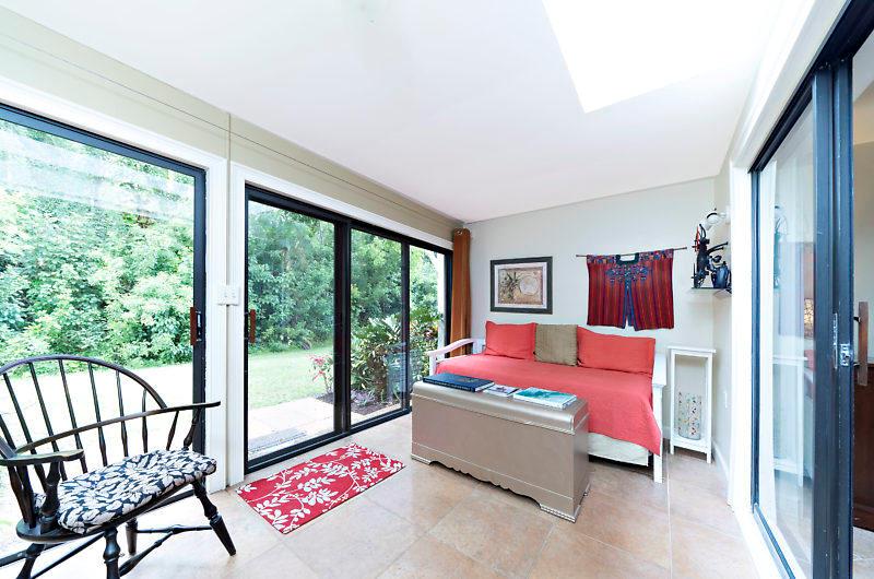 Entering this open-plan townhome through the spectacular ''blooming cactus and orchid'' garden is a treat. Inside your eye is immediately drawn to the unique kitchen island with its ''Indian rainforest'' pattern stone top. The surrounding kitchen is a chef's delight with granite counters, stainless appliances and quality cabinetry plus an inviting peninsula bar to entertain your guests. The open theme continues beyond the kitchen with a tray ceiling living and dining area, then on to the airy sky lit enclosed porch/office with a delightful view of a dedicated green space. Two excellent storage areas and a half bath complete the main floor.Upstairs are two beautifully updated ensuite bedrooms. The guest room receives excellent privacy from the blooming cactus outside the window and it