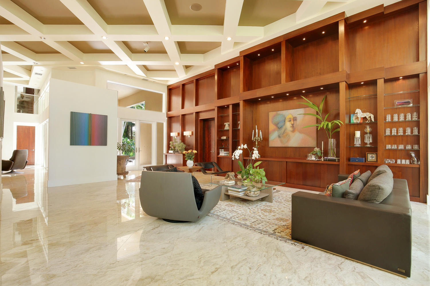 The tremendous courtyard of this double lot property invites you to enjoy your privacy and indulge in the perfectly curated lush tropical landscaping surrounding the freeform pool. Pass through the double doors into the main house boasting an oversized great room, formal dining room, and state-of-the-art kitchen, which opens up to the family room. Attention to detail is visible in the custom kitchen cabinets, 24" marble tiled floor, fabulous built-ins and coffered ceilings. Complete with impact glass on the main windows of the house, natural light abundantly lights up the entire home. The master bedroom, located on the ground floor, has plantation shutters for extra privacy, and the spa-like bathroom has been completely remodeled to include a waterfall shower, double vanities, and custom