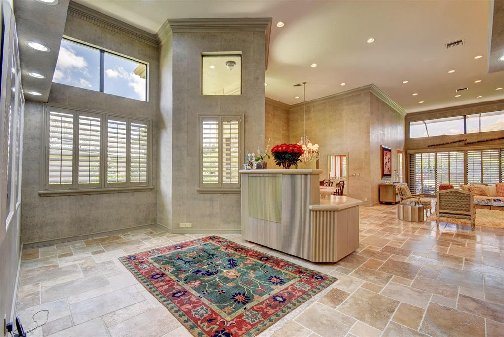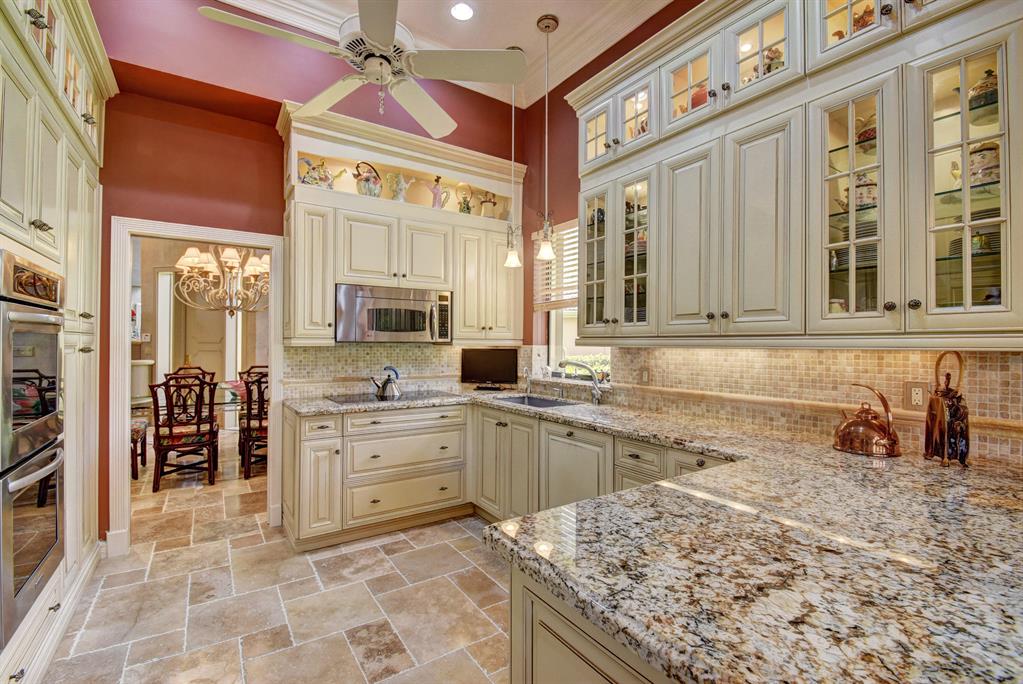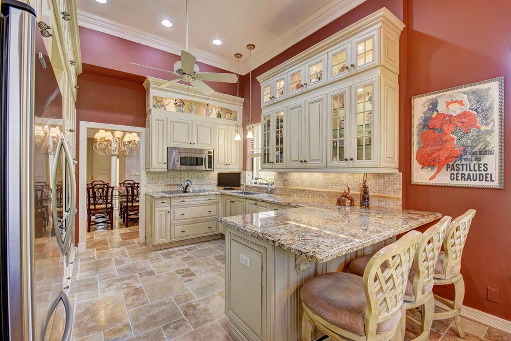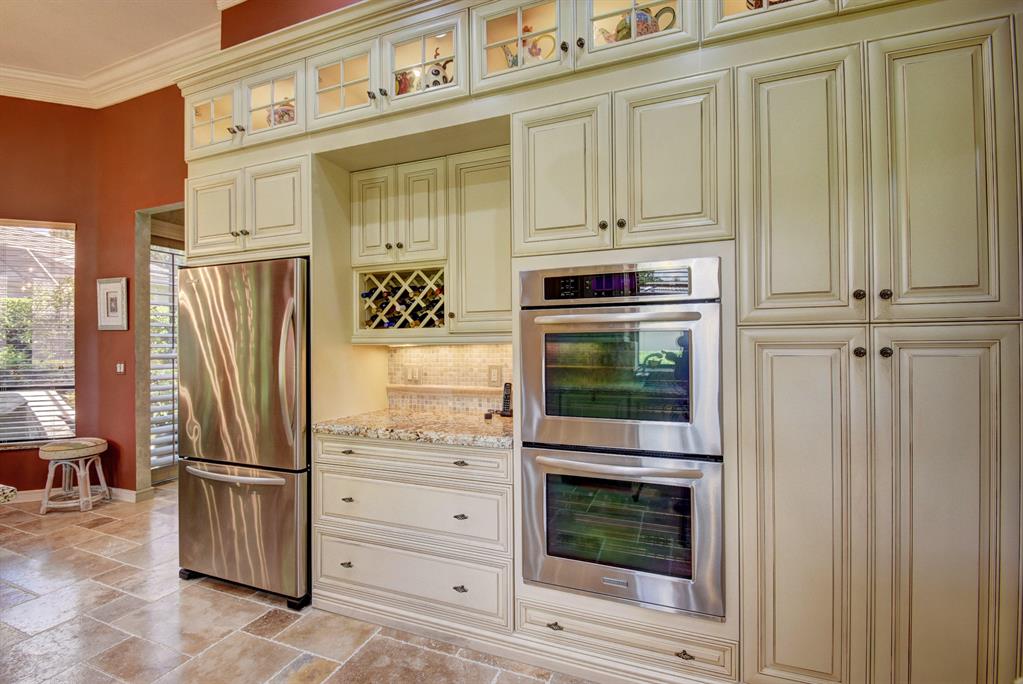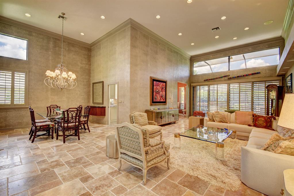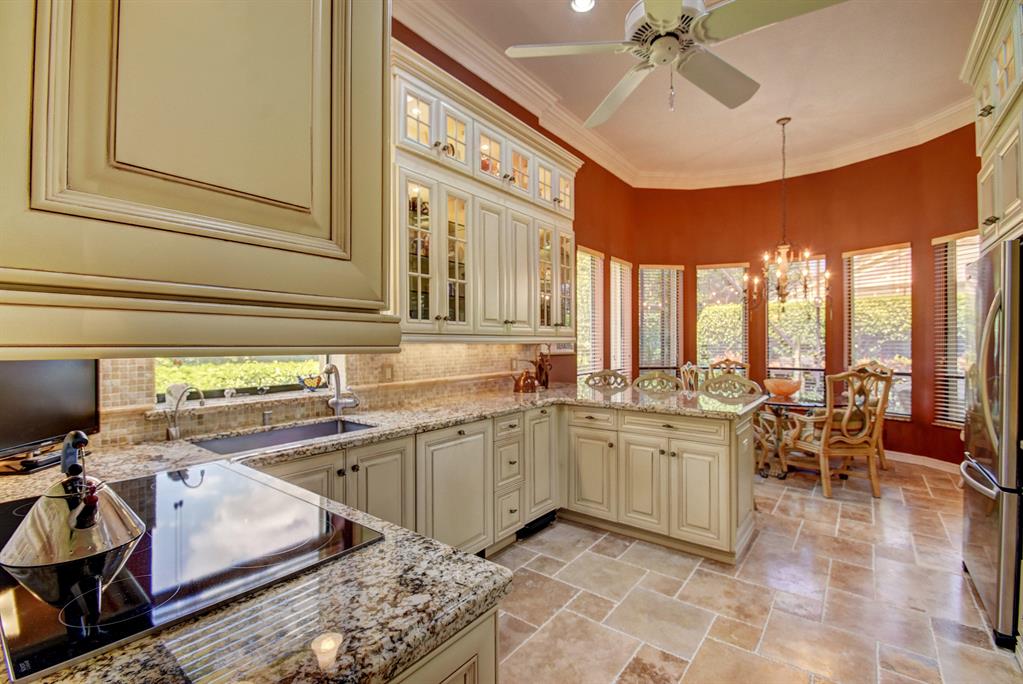 Great Space & Value! Located on a quiet cul-de-sac, this remodeled 1-story home of 3 bedrooms & 2 1/2 baths on a pie-shaped lot is open & spacious and larger than other one-story homes in the Cove. Elegant features include Jerusalem stone floors; volume ceilings & crown moldings; beautiful gourmet kitchen of ivory 42'' cabinets with roll-outs & self closing drawers,granite counters,onyx tile backsplash, stainless steel appliances & a charming breakfast nook;spacious master suite with custom-configured closets; remodeled Master Bath with Jerusalem stone & granite counter; upgraded powder room with Sherle Wagner sink; plantation shutters & wood blinds; LED high-hats; central vac system; newer washer & dryer;accordion hurricane shutters & a private screened patio. The roof is about 7 yrs old