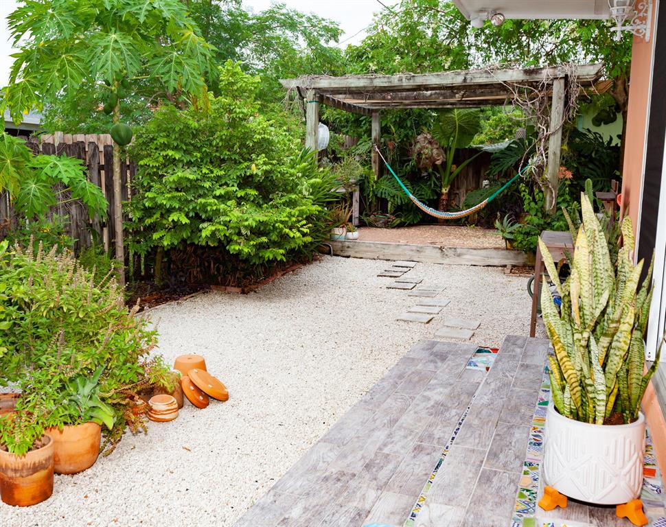 A magical three bedroom, two bath home within a park like setting. This artistically designed and decorated home is surrounded by lush landscaping with an abundance of flowers and fruit tress. You'll feel like you're on vacation as soon as you turn into the driveway. Perched in this little known neighborhood with an entrance to the park at the end of your street, there is only one way in. Just walk to Palm Beach Zoo and the Science Museum at Dreher Park. The home features Terrazzo floors, large oversized soaking tub to destress and make the world go away, gas range, impact windows, one of the most unique ceilings I've seen in the family room that allows even more natural lightening into this home. Your home searching quest may be over once you view this beautiful home.
