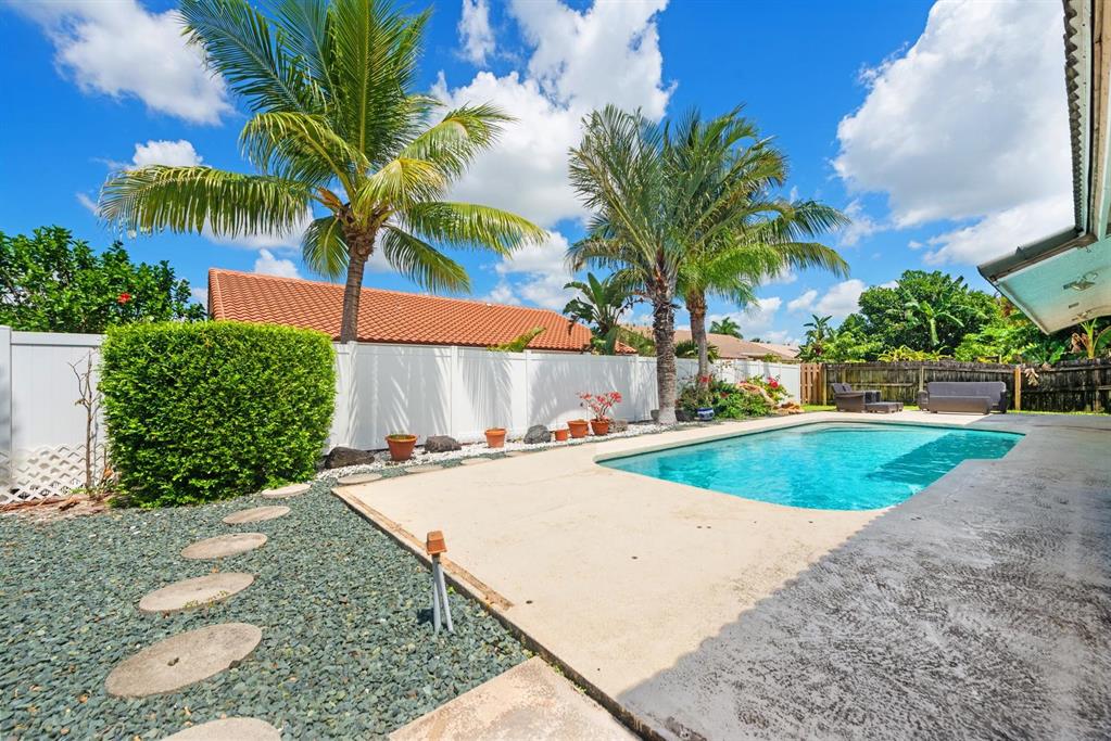 Light & Bright 4BD/2BA East Boca home with vaulted ceilings, open floor plan, & beautiful pool with fully fenced, private backyard! The very versatile layout is perfect for a family and/or entertaining! Large kitchen with center island opens to family room area. Tile flooring thru out, spacious master bedroom with walk-in closet. Long driveway offers parking for 4+ vehicles. East of I-95 & perfectly located in sought after Hidden Valley--close to shopping, restaurants, major roads & less than 3 miles to the the BEACH! All A-rated Boca Schools! Only blocks from the Hidden Lake Park with newer playground, shade trees, picnic tables & 2 tennis courts!