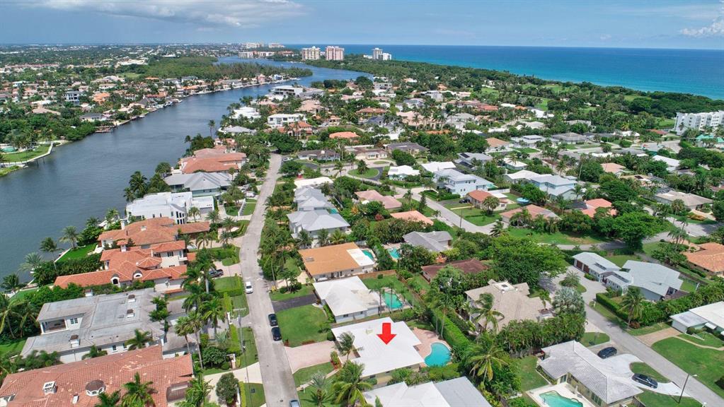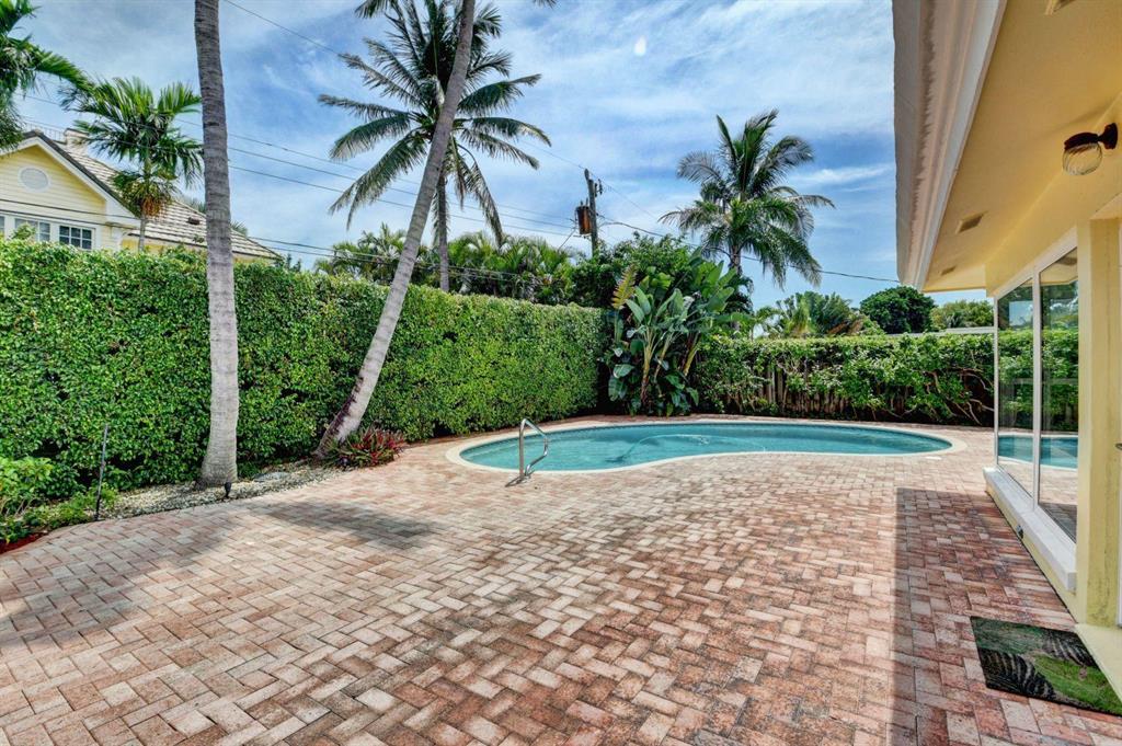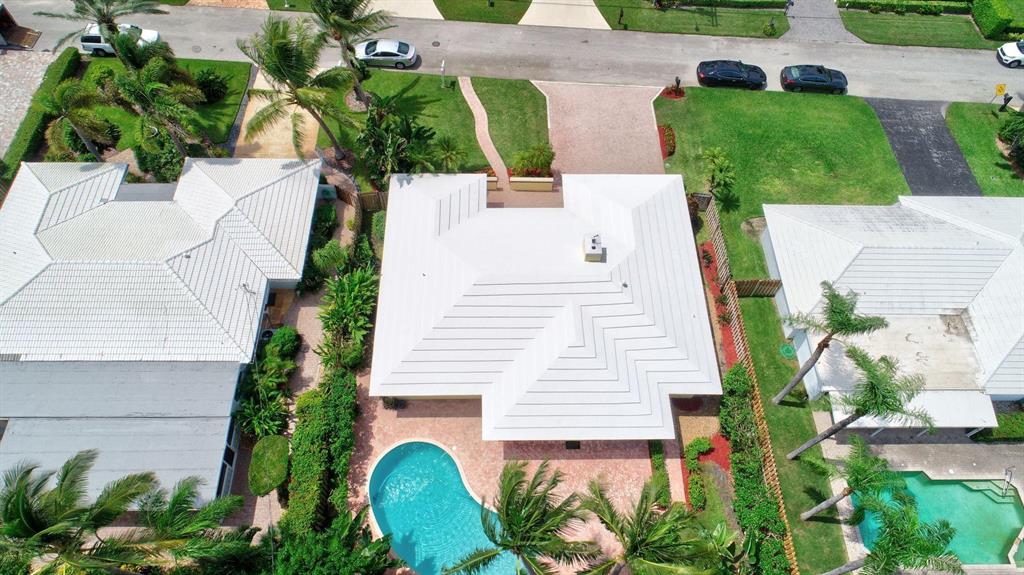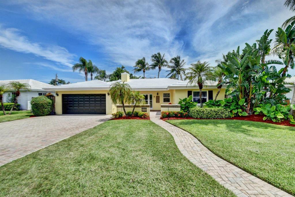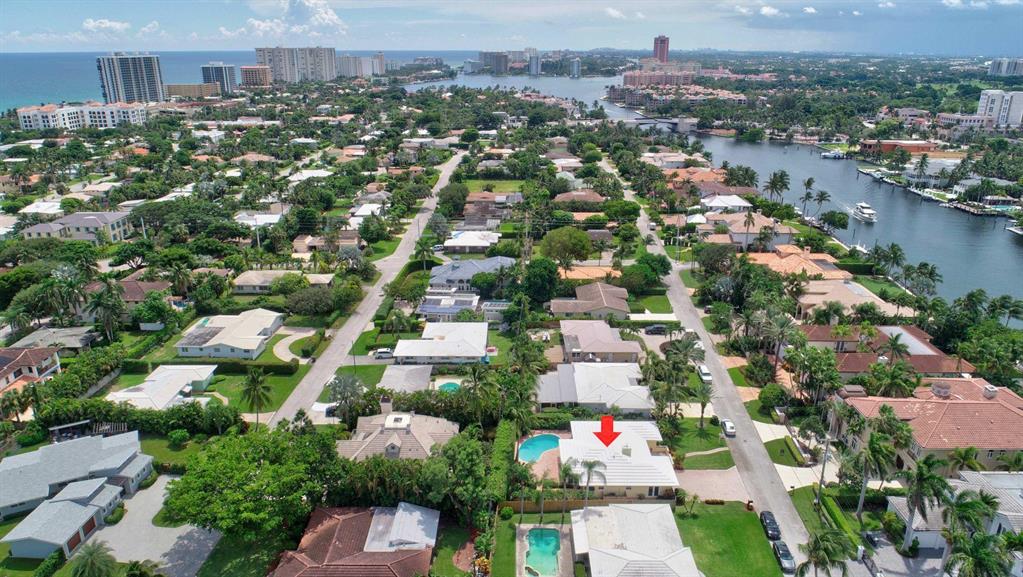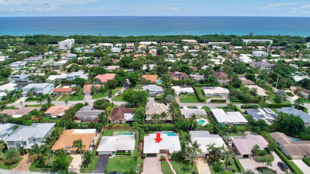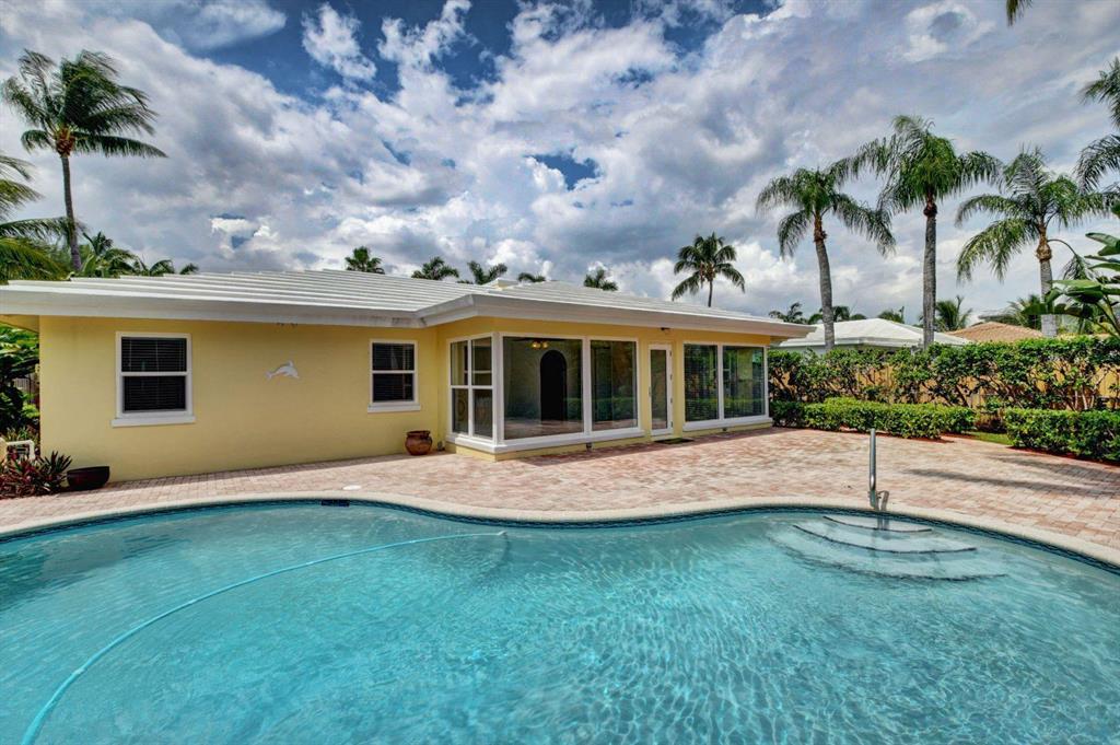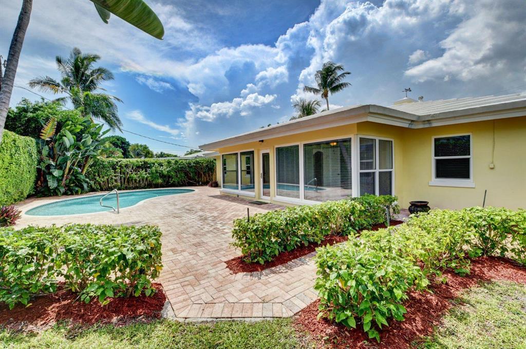 Fall in love with this sunny and inviting mid-century modern 2BR/3BA plus office pool home just a few blocks from the ocean. Located in a lush barrier island enclave between the Intracoastal and the Atlantic, the home is an easy walk to the beach, golf course, Red Reef Park, Gumbo Limbo Nature Preserve and a host of fun shops and restaurants. Natural light fills the open floor plan, and walls of windows look out to its lovely terrace, pool and manicured landscape. Charming period details like classic parquet floors, vintage tile and interior arches have been preserved to blend with updates that include impact windows and doors and a sleek kitchen with stainless appliances and granite counter tops. Other notable upgrades include custom closets and a newly refinished Diamond Brite pool.