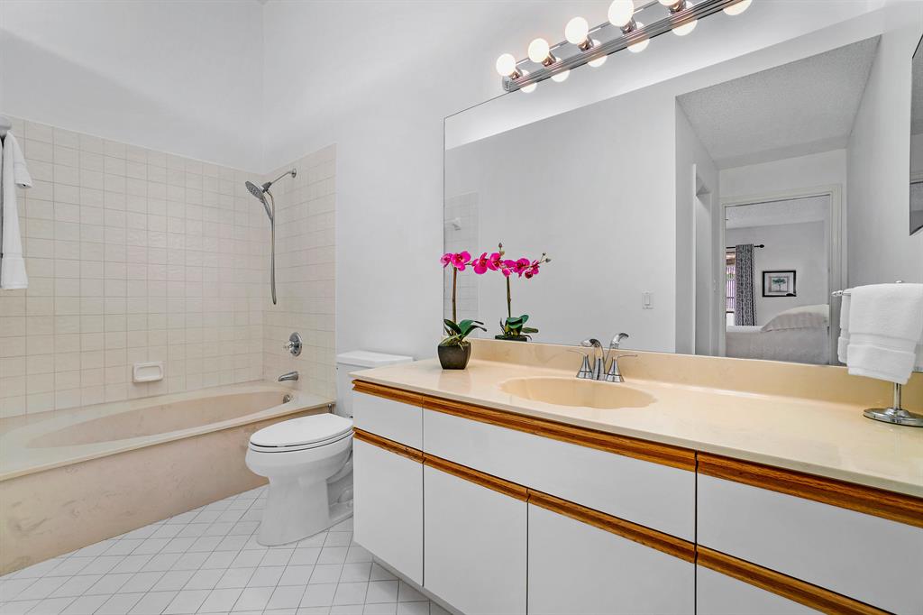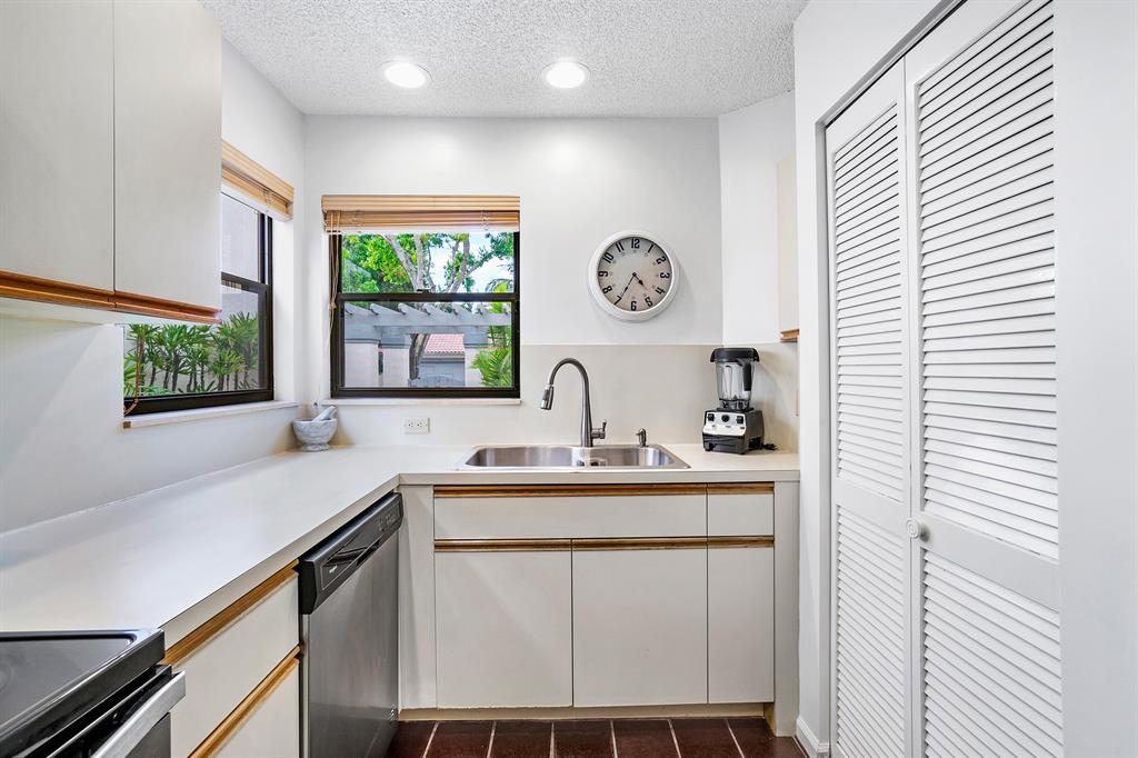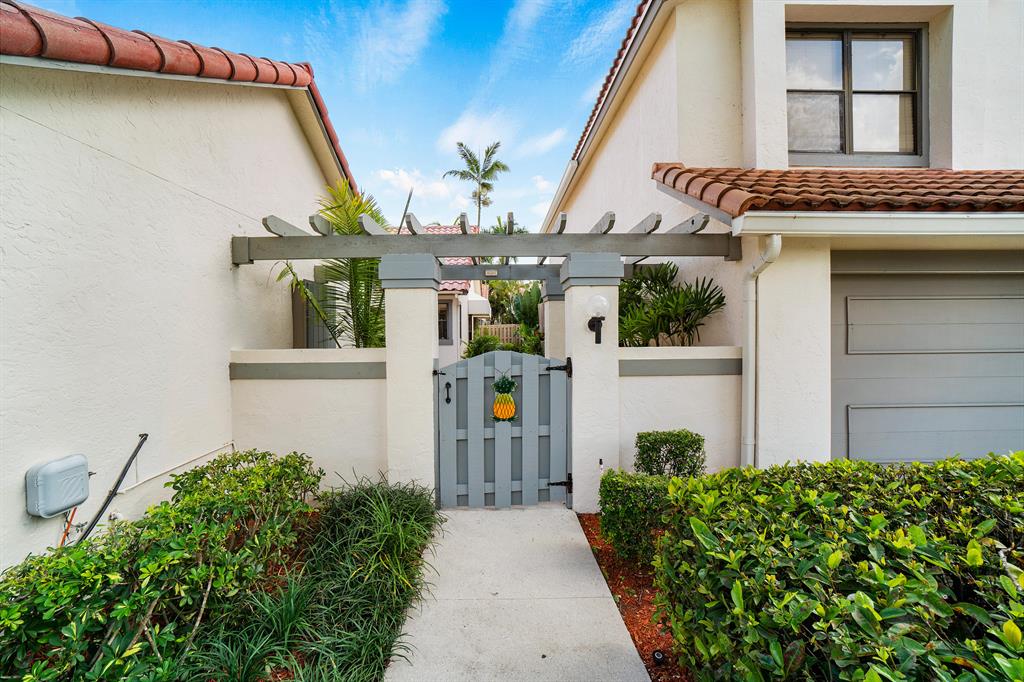 Priced to sell! This home shows beautifully! Pristine one story detached home offers zen inspired touches throughout. Redesigned light & bright open floorplan boasting dual master suites, tile floors in living area, vaulted ceilings & split BR's. Both master suites offer walk in closets ad private baths. Charming beautifully landscaped tropical courtyard offers screened patio plus open patio perfect for added outdoor living space and entertaining. Open kitchen with stainless appliances overlooks your private gated courtyard entry. Two skylights & plentiful windows bringing natural light throughout the home. Two car garage with extra storage. Located in the best TOWN CENTER location! 24 hour manned gate. Walk to Greenwise Publix, Town Center Mall, Boca Center, tennis, shops & restaurants