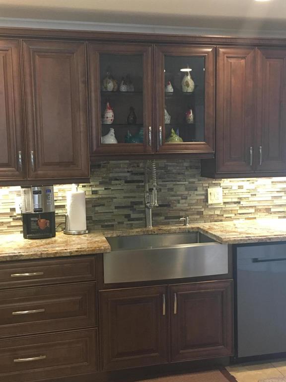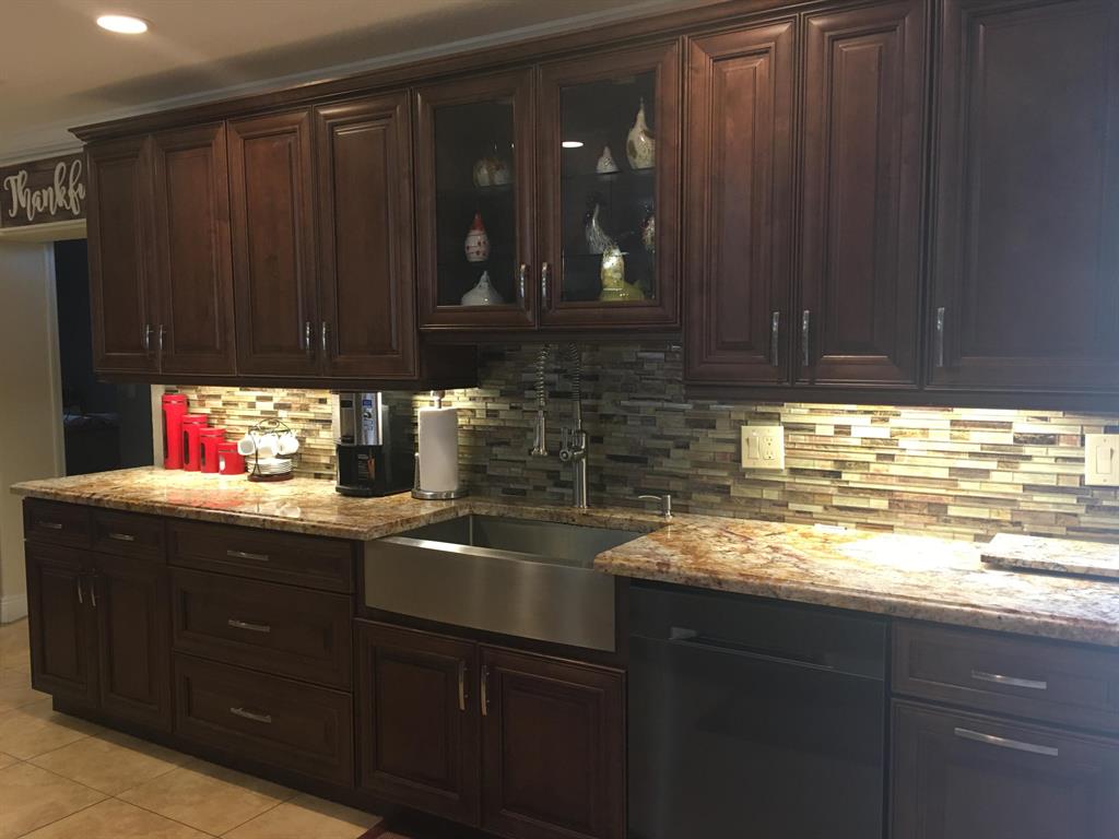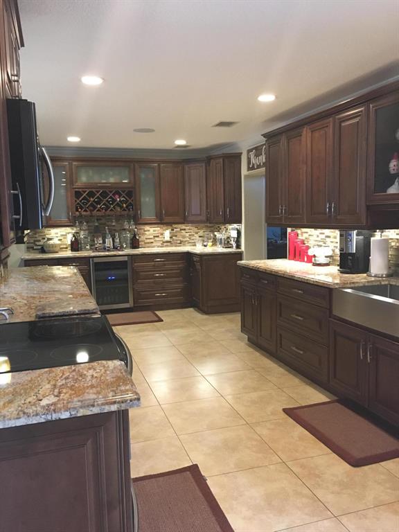 BACK ON MARKET! BEAUTIFULLY REMODELED 4/3! . TILE THRUOUT HOUSE. 1 BEDRM CARPETED. GOURMET KITCHEN INCLUDES 36'' WOOD CABINETS W/MOULDING & LIGHTS, GRANITE COUNTERS,TILE BACKSPLASH & A WINE CHILLER! SS APPL INCLUDE A DOUBLE OVEN WITH A WARMING DRAWER & A FARMHOUSE APRON SINK. LARGE GRANITE BREAKFAST BAR OPENS TO SPACIOUS LIVING AREA. OTHER FEATURES INCLUDE SPLIT FLOORPLAN, CROWN MOULDING & RECESSED LIGHTING. WIRED FOR CAMERA SYSTEM, ALARM SYSTEM & SURROUND SOUND. HOME HAS 2 MASTER SUITES. SPACIOUS MASTER BEDROOM HAS LARGE WALK-IN CLOSET. ALL 3 BATHROOMS HAVE NEW TILE & VANITIES. LARGE LAUNDRY ROOM. W/D DOES NOT CONVEY. COVERED PATIO. LARGE FENCED YARD. 1 CAR GARAGE. NEW RHEEM 4 TON 16 SEER A/C 2017, 8 YEARS LEFT ON WARRANTY. WATER HTR 3 YRS OLD. FLAT ROOF OVER ADDITION 5 YRS OLD. NO HOA!