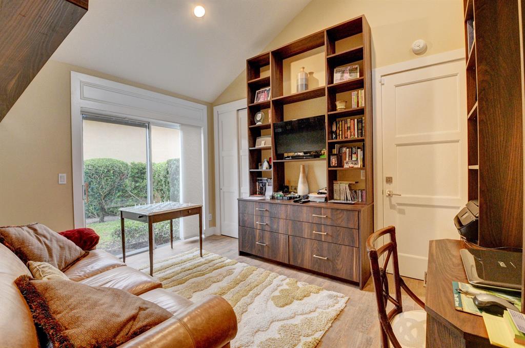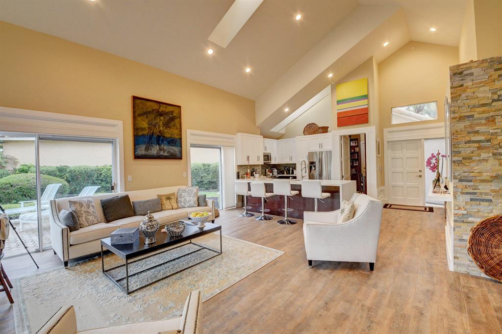 Totally renovated by Marc Stano.Located on the 7th hole of club course. Newer roof, lovely landscaping, beautiful natural light from sunrise coming in from skylights as well as western sunsets. Fantastic newly renovated bathrooms and kitchen which opens up to living room. Newer appliances. Third bedroom can be used as office/den. Built-ins in office and living room. Plank wood like laminate throughout.Super community pool and beautify maintained.Capital contribution at closing is $1000. Applications $250 plus 100.