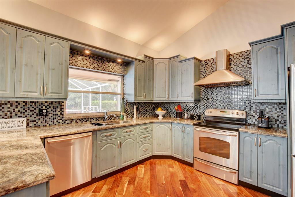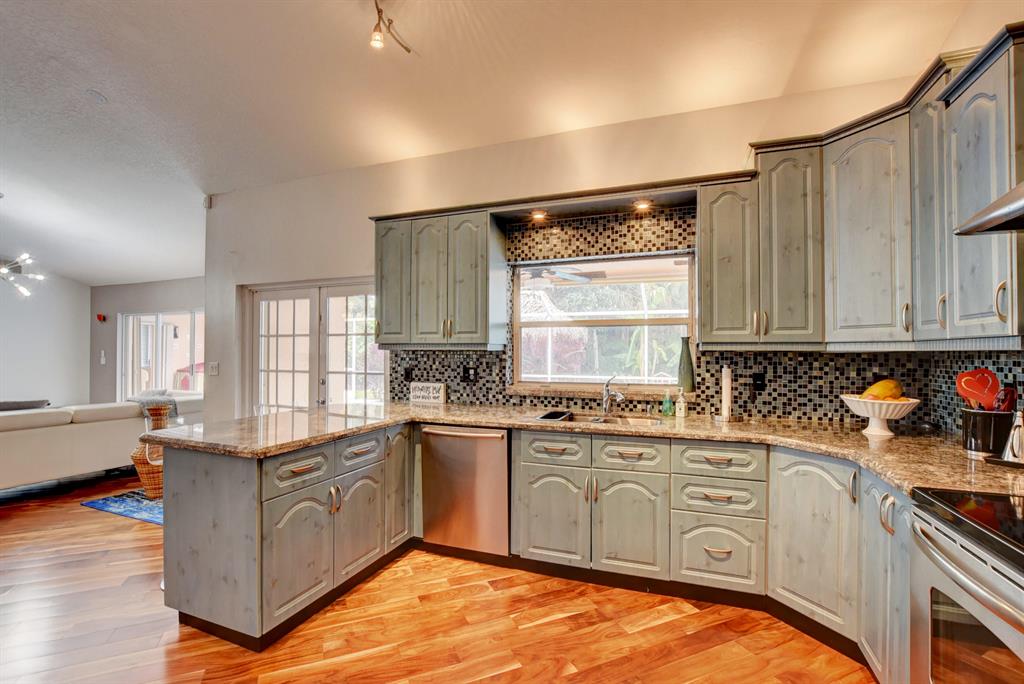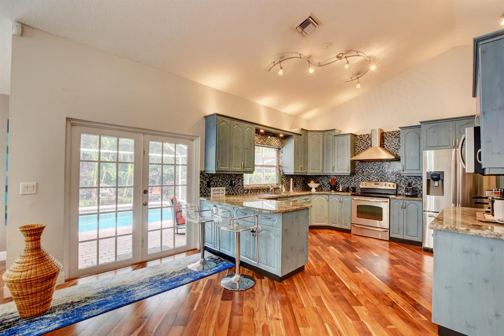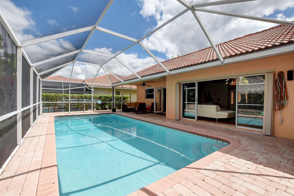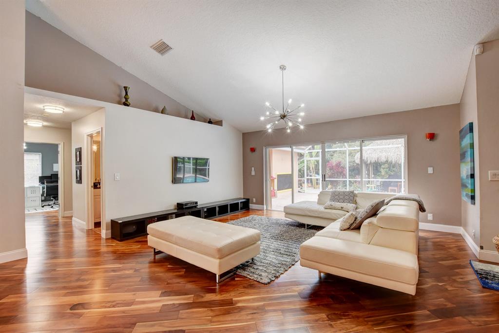 One of a kind, move in ready, beautifully upgraded home in a fantastic guard gated community. Engineered hardwood Acacia wood floors throughout with moisture barrier and 30 year warranty. Italian gourmet kitchen and marble countertops. Newer refrigerator replaced Nov. 2018, tankless, energy efficient water heater replaced 2018, convection microwave replaced 2018. Unique, private backyard backs to a tropical wildlife protected preserve where the closest home is over a block away. Salt water, maintenance free pool with pavers and a 2 year old recirculating pump system. Fully fenced yard with tiki hut that includes water and electric. Front has circular brick paved driveway. Complete storm protection on all windows and sliders. Low HOA. Schedule an appointment to visit.
