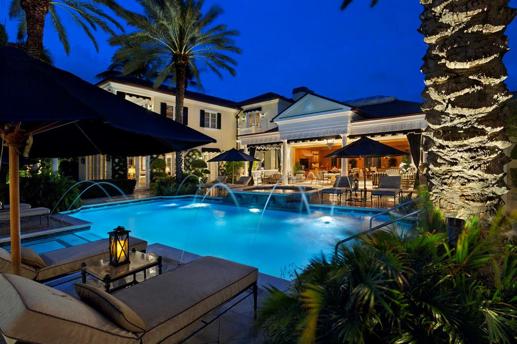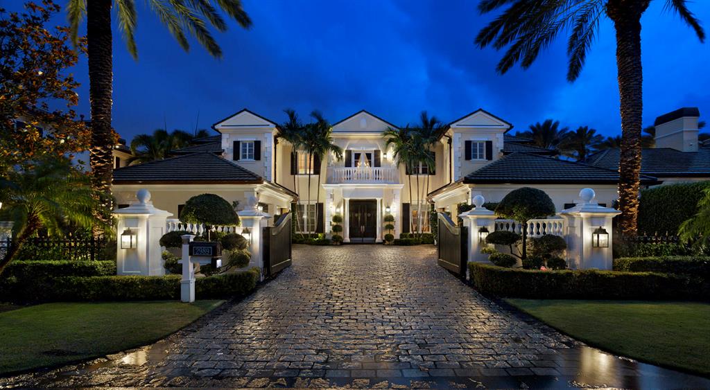 Gated and walled Palm Beach-inspired Georgian Intracoastal Estate sited on 2 lots with 200 +/- feet of waterfrontage overlooking an expansive view of the ICWW.Lavish entertaining is set in the center Party Pavilion (Great Room 37 x 26) with professional bar, soaring fireplace and large window wall of sliders that open to the pool/patio.Resort-style pool/patio with spa,fountain, boat lift and expansive landscaped grounds for entertaining. Shown By Appointment Only.