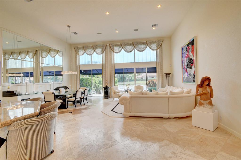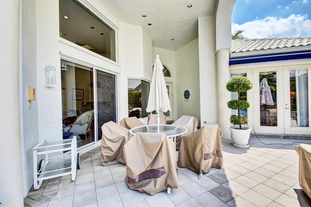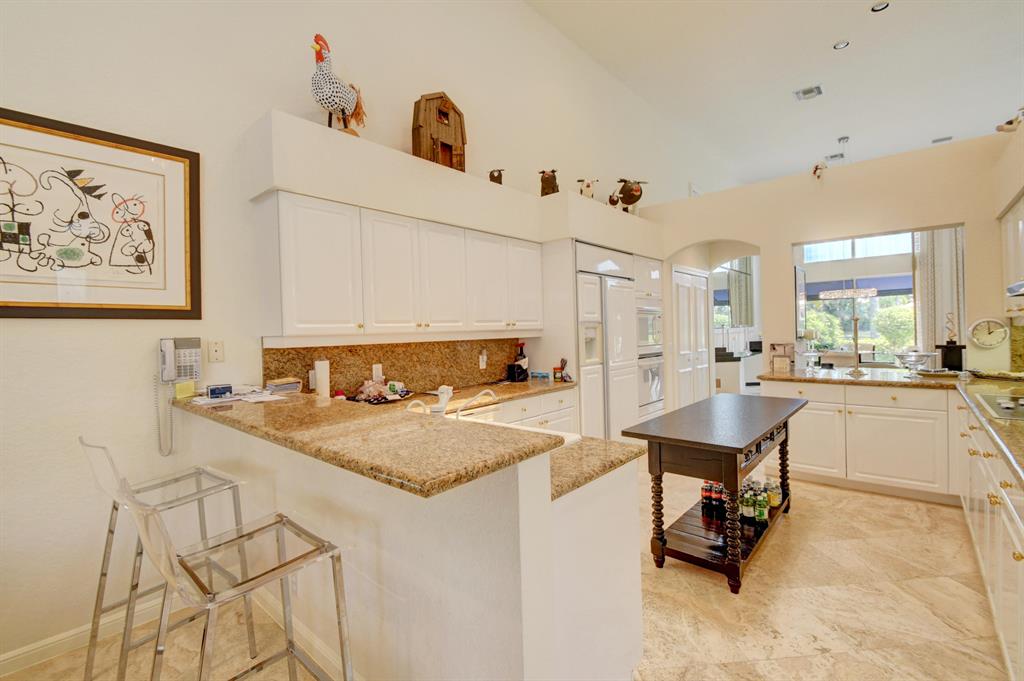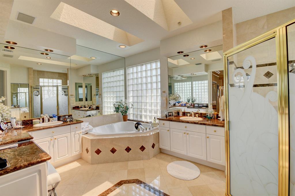 This light & open one-story 4 bedroom/4 1/2 bath home offers the privacy of a courtyard & tranquility of spectacular lake views! Tasteful appointments include volume & tray ceilings with crown moldings & speakers, Saturnia marble floors & upgraded carpeting, a beautiful built-in library,elegant built-ins in the Family Room,Master Bedroom & Dining Room,an open kitchen with white high-gloss cabinets & granite counters,instant hot & water filtration,wet bar with granite counter, custom window treatments,custom closet design,skylights & extra high-hat lighting,custom framed mirrors, solid core molded doors,intercom & central vacuum,oversized 2-car garage,metal & acrylic hurricane panels, extensive landscaping & a wonderful patio area perfect for entertaining with a grill, freeform pool & spa.