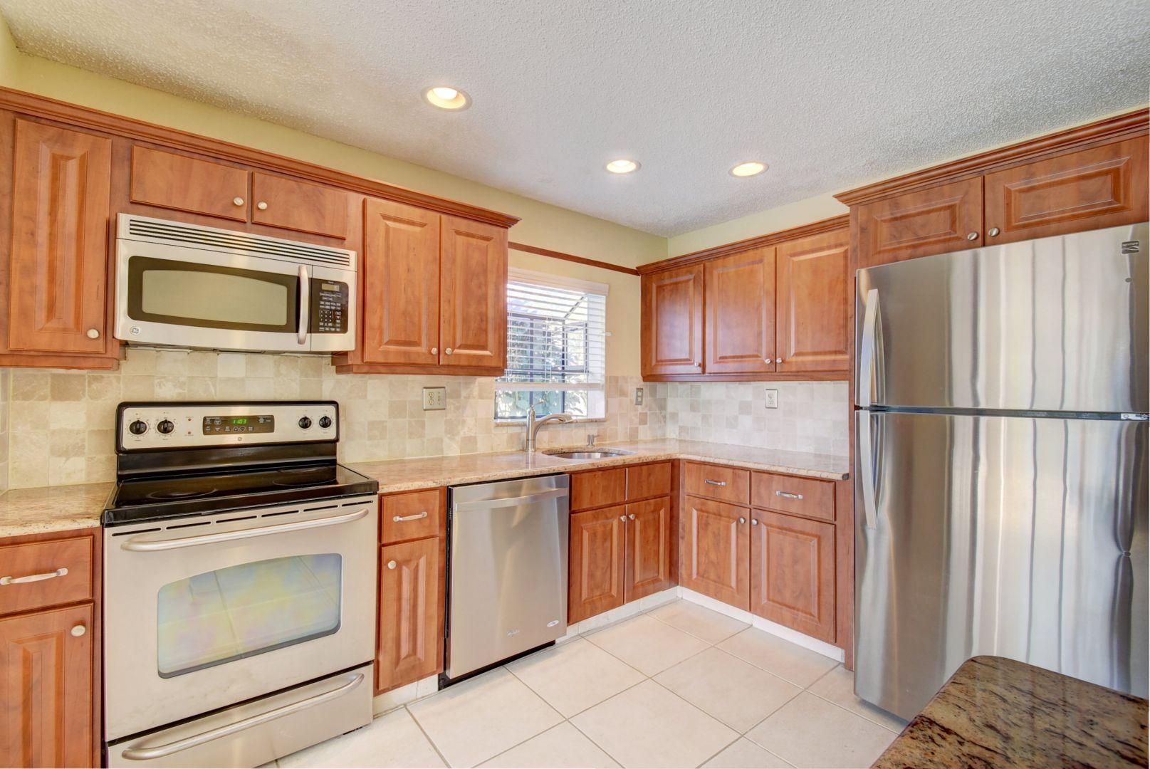 Great corner lake view home with vaulted open beam ceilings, updated kitchen with granite and stainless steel appliances, updated bathrooms and tile flooring throughout! A/C is 2016! Upgraded washer/dryer. Brand new generator included. There is an oversized screen enclosure to entertain outside by the lake.No club membership required.