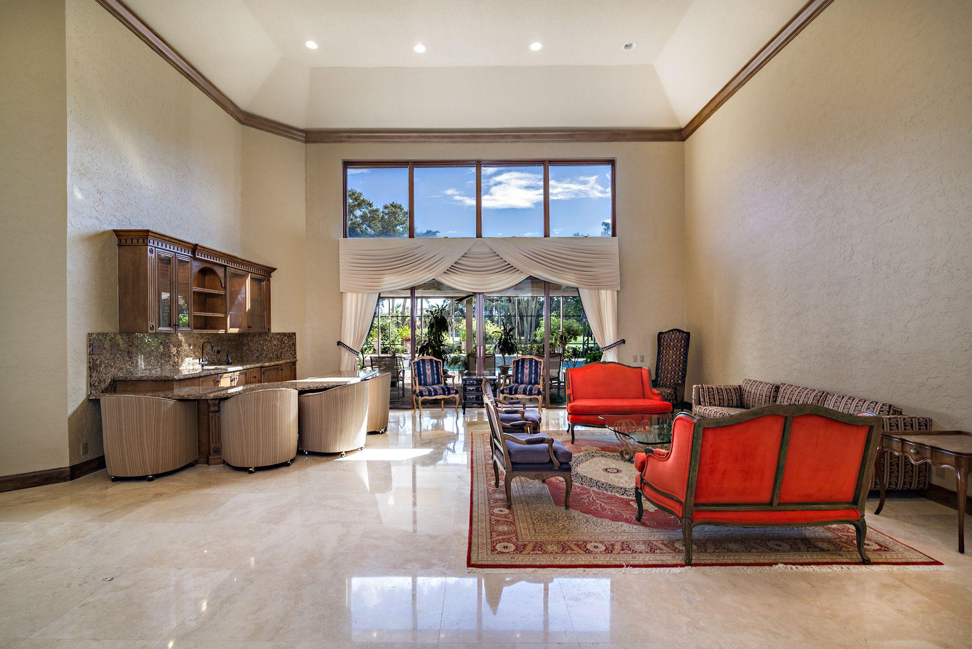 Situated on a double fairway lot with 4,417 SF of air-conditioned living space, this 4 bedroom, 5.5 bath pool home is perfect for entertaining. Features include a thoughtfully designed split bedroom plan, high ceilings, marble and wood flooring, and sun-splashed oversized screened pool; formal dining room, living room with wet bar and spacious family room. There is a whole house generator, partial impact glass and electric shutters for storm protection. Mandatory Club Membership Required.