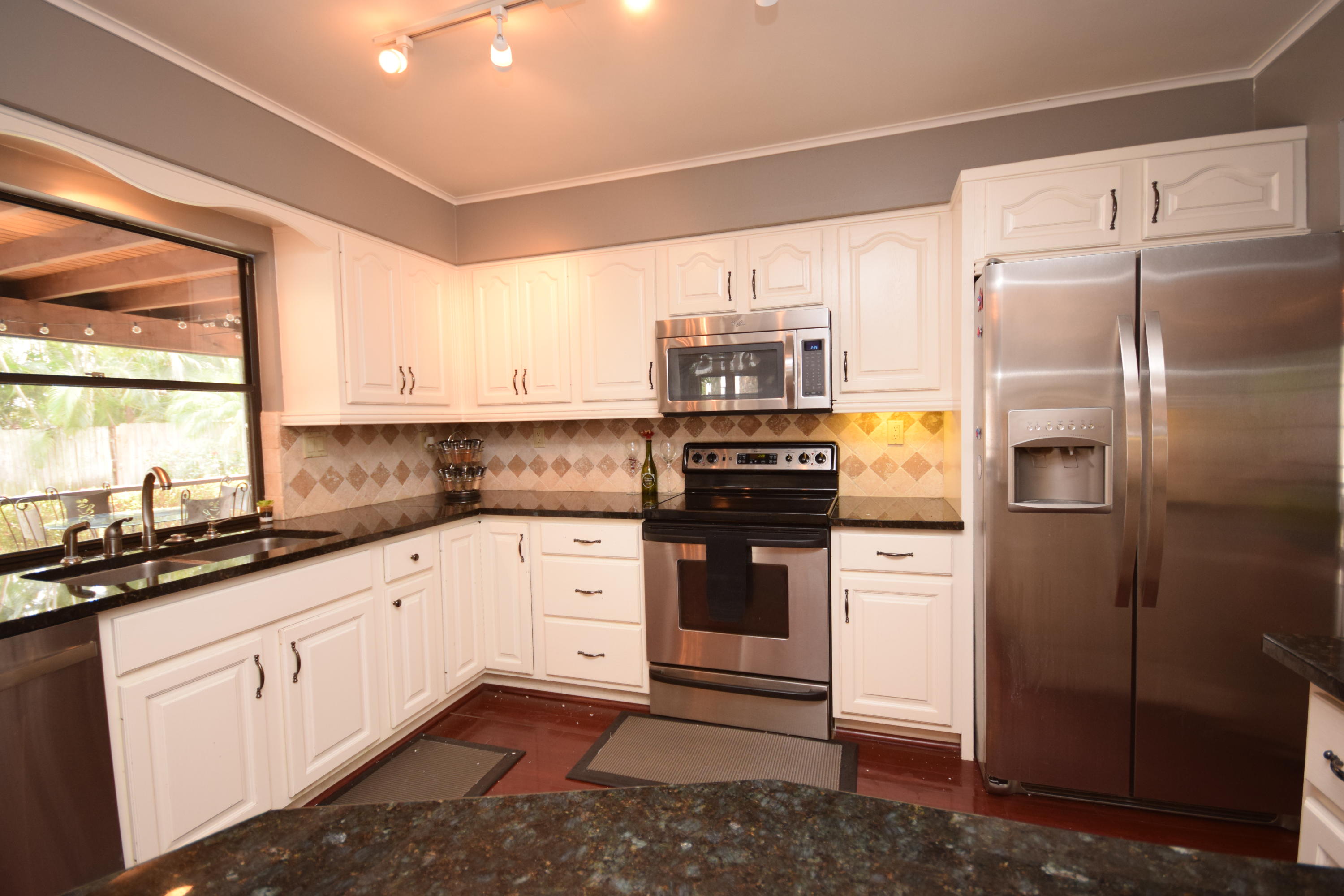 Prime East Boca location. Close to beaches, shopping, highways, place of worship, restaurants and more. This home sits on a huge corner lot with tropical landscape, screened patio and freeform pool. Split floorplan that can easily be converted to a 4 bedroom. Home features wood burning fireplace, inside laundry room, newer a/c, stainless appliances and granite countertops. Front courtyard patio provides extra outdoor space. This home has endless potential! Chandelier in the front room is excluded.