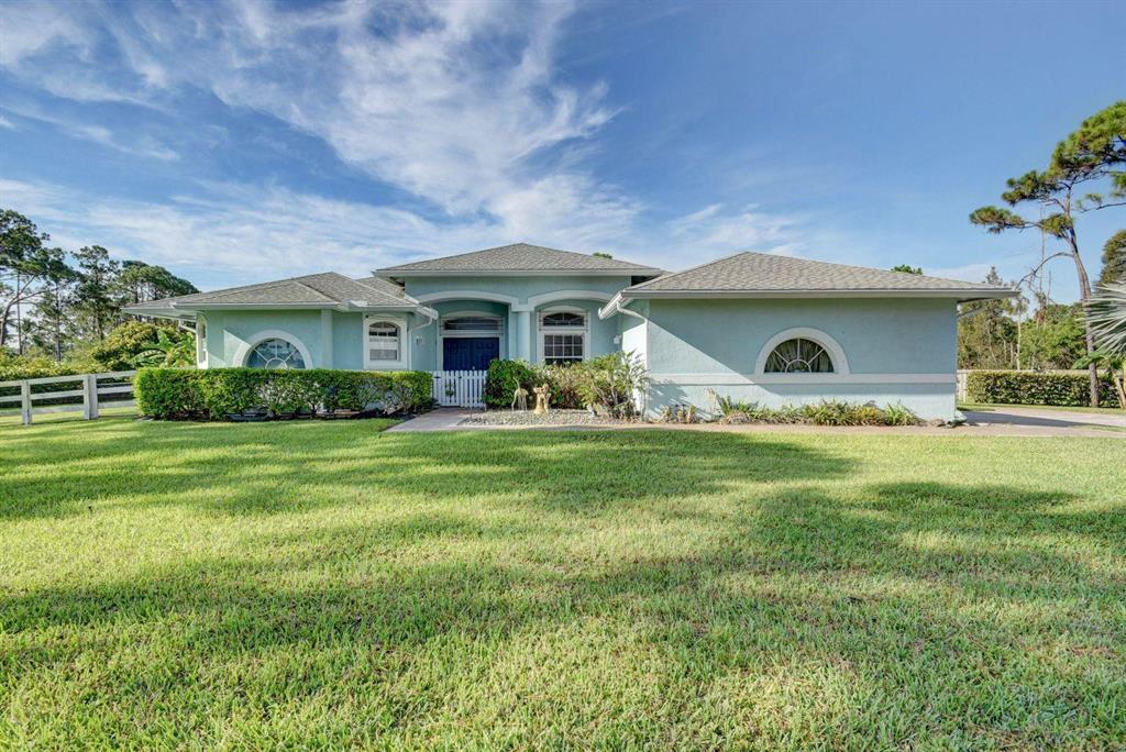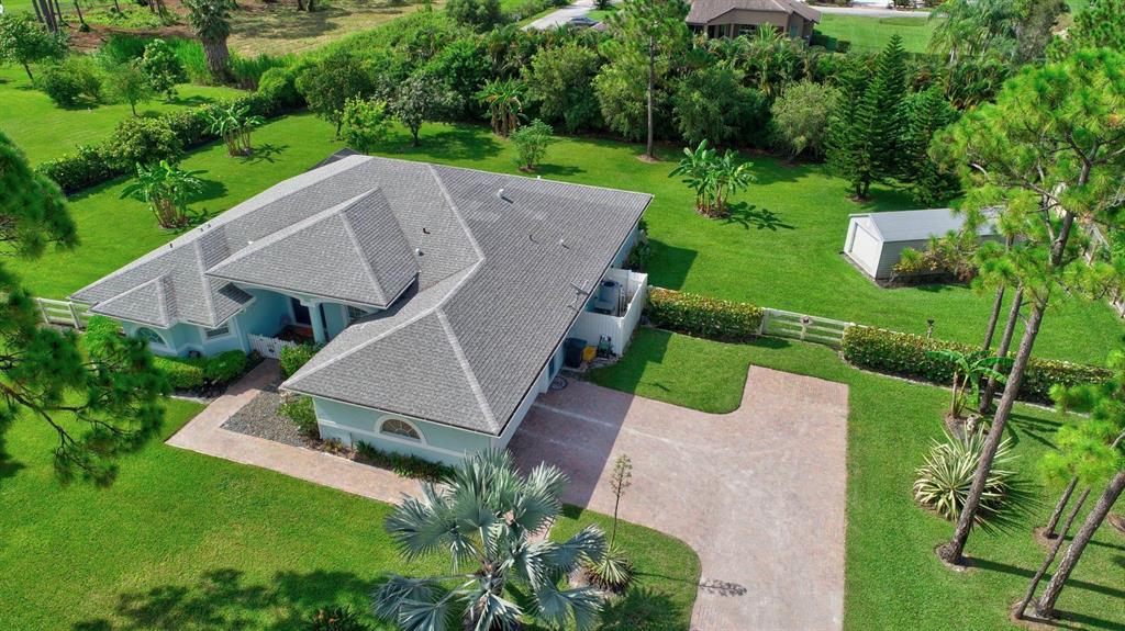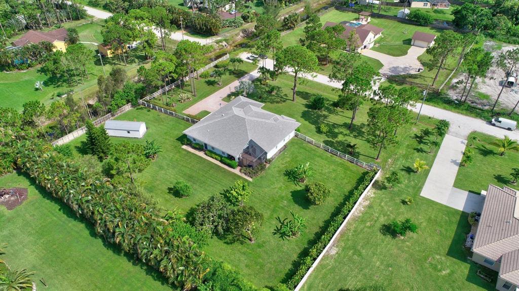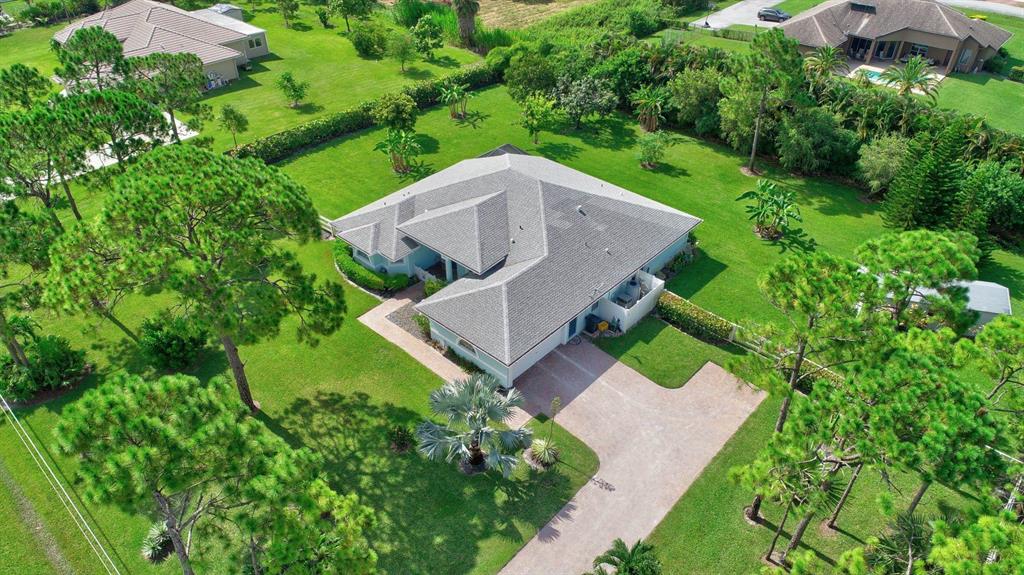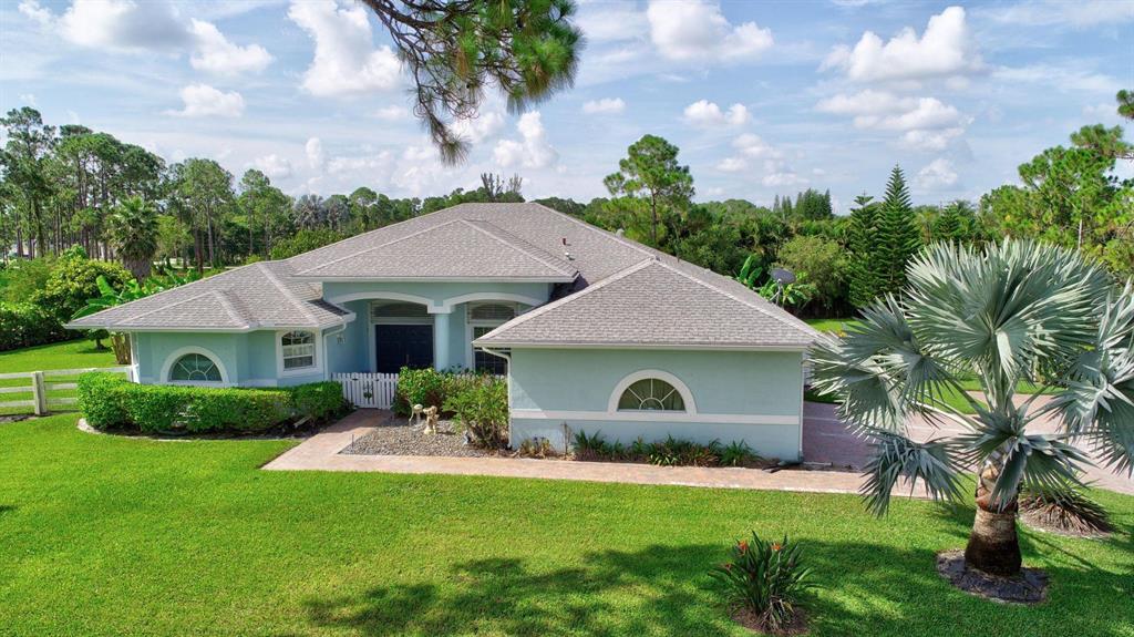 Situated at the end of the road on 1 1/3+/- glorious acres, this sprawling 4-bedroom, 3-bath house with 2-bay garage offers true privacy and the space to enjoy it. The fluid design of this bright open plan lends itself to easy living and even easier entertaining.Tile flooring unifies the living room, dining room, family room and kitchen. The chef's kitchen is graciously appointed with granite counters, well-crafted cabinetry, high-end appliances, a breakfast bar and a large pantry.A secluded double door master suite features his and hers walk-in custom closets, ensuite bath with his shower and her soaking tub, a sitting/office area, and private access to a roomy screened-in patio, that looks out on seemingly endless lawn, mango & banana trees and