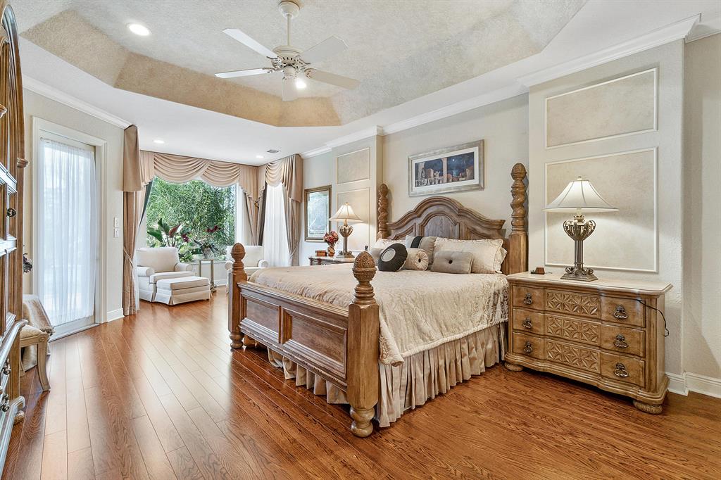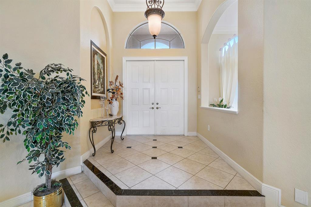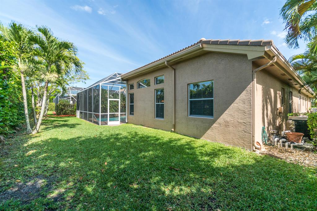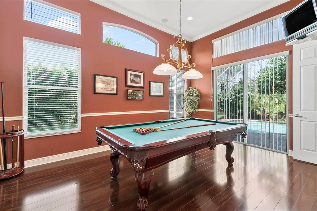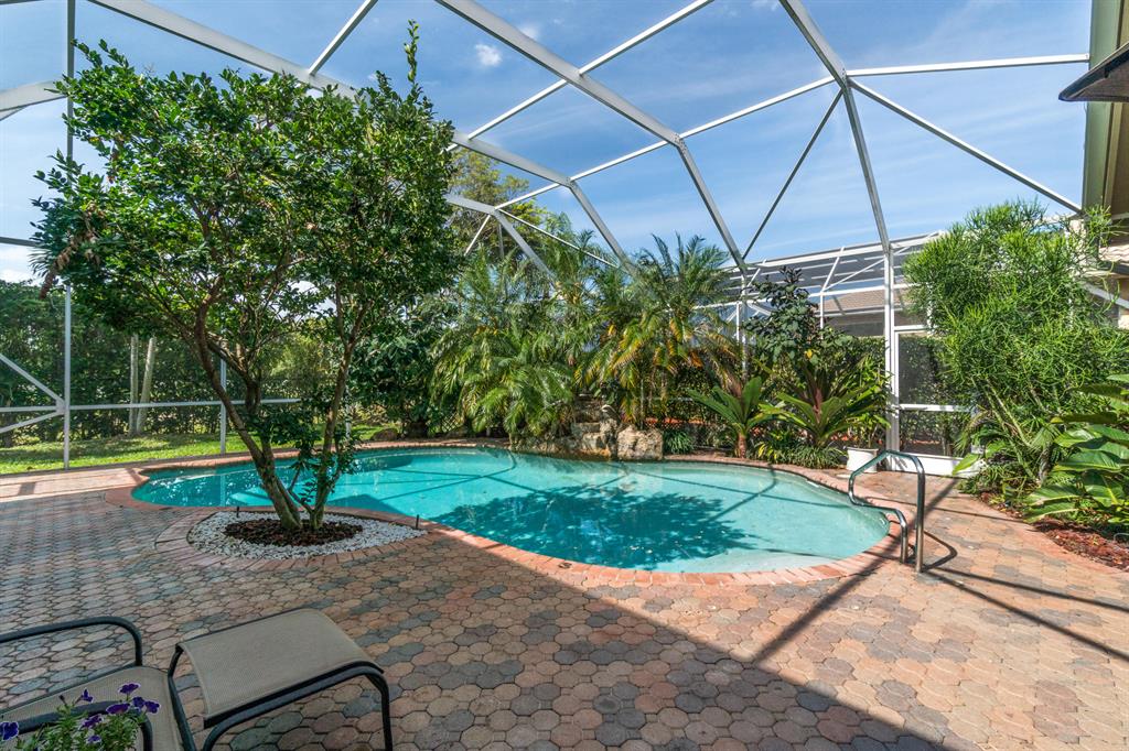 This lushly landscaped one-story home sits on a private treed lot backing south.Great split bedroom plan with 5 bedrooms,game room,3 baths and a 3 car garage.Tile has been installed on the diagonal.There are wood laminate floors in all of the bedrooms and game room.Perfect for entertaining,there is a formal living room,dining room and butler's pantry/bar.The gourmet kitchen features wood cabinets,granite countertops,tumblestone backsplash and all the bells and whistles!There is a center island,snack bar and separate breakfast nook.The family room,with built-in,is open to the kitchen.The game room is a perfect place for a pool table or playroom.The master suite features a sitting area,outfitted walk-in closets and luxurious marble bath.Backyard resort-covered,screened patio and heated pool.