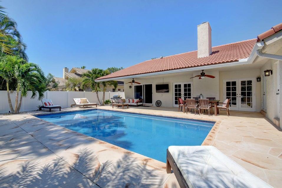 Cedar vaulted ceilings, wood floors and a working fireplace contribute to the unique ambiance of the 4 bedroom 2 1/2 bath captivating home. Updated kitchen and bathrooms with an abundance of storage make this home very desirable. The pool and patio area become your very own private retreat with no view of neighbors anywhere. Lush landscaping and built-in sound system complete the home. Low HOA and great location in a fun-filled neighborhood with park, tennis courts and pond close to Town Center mall, Delray Beach and trendy Atlantic Avenue.