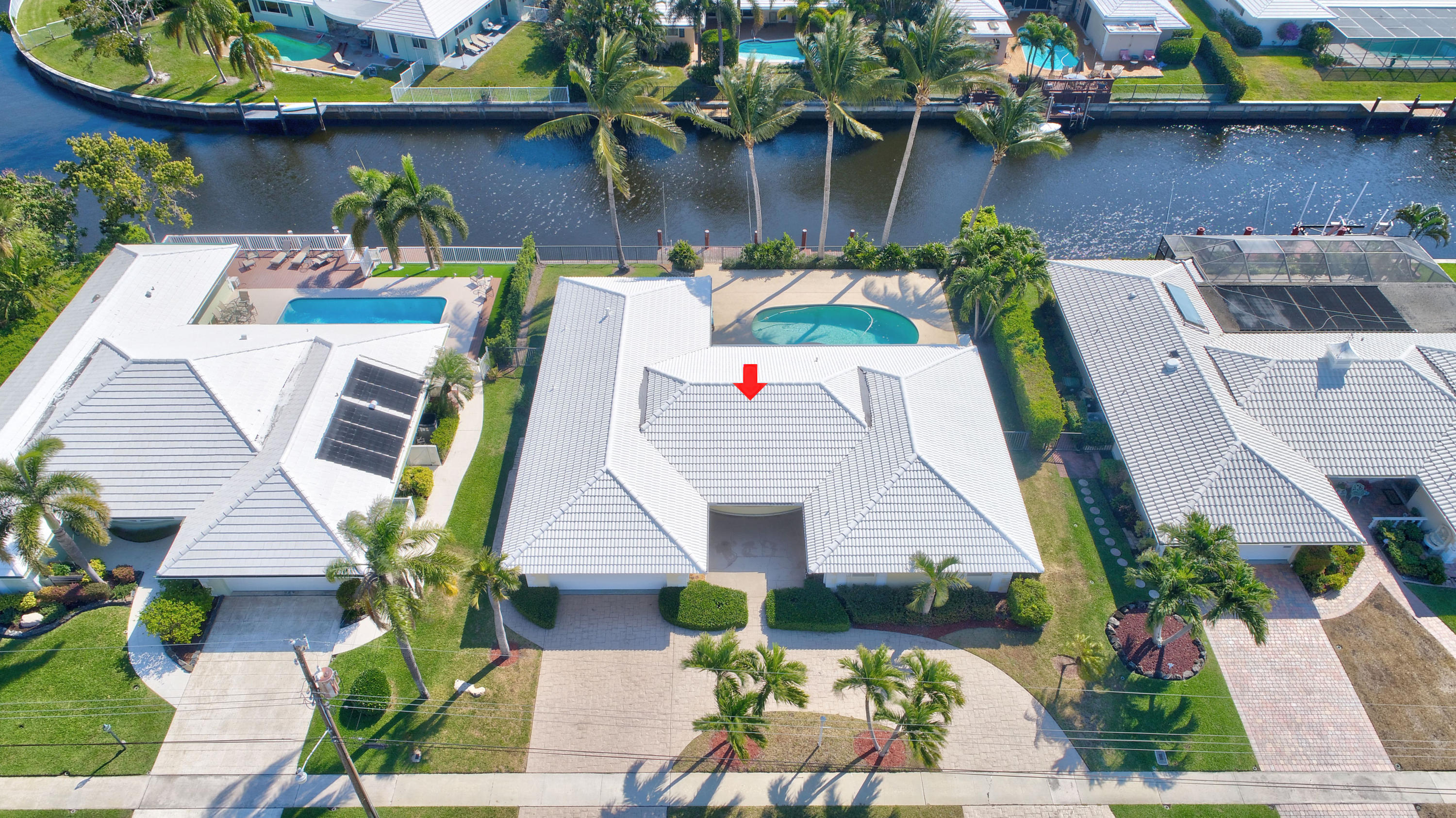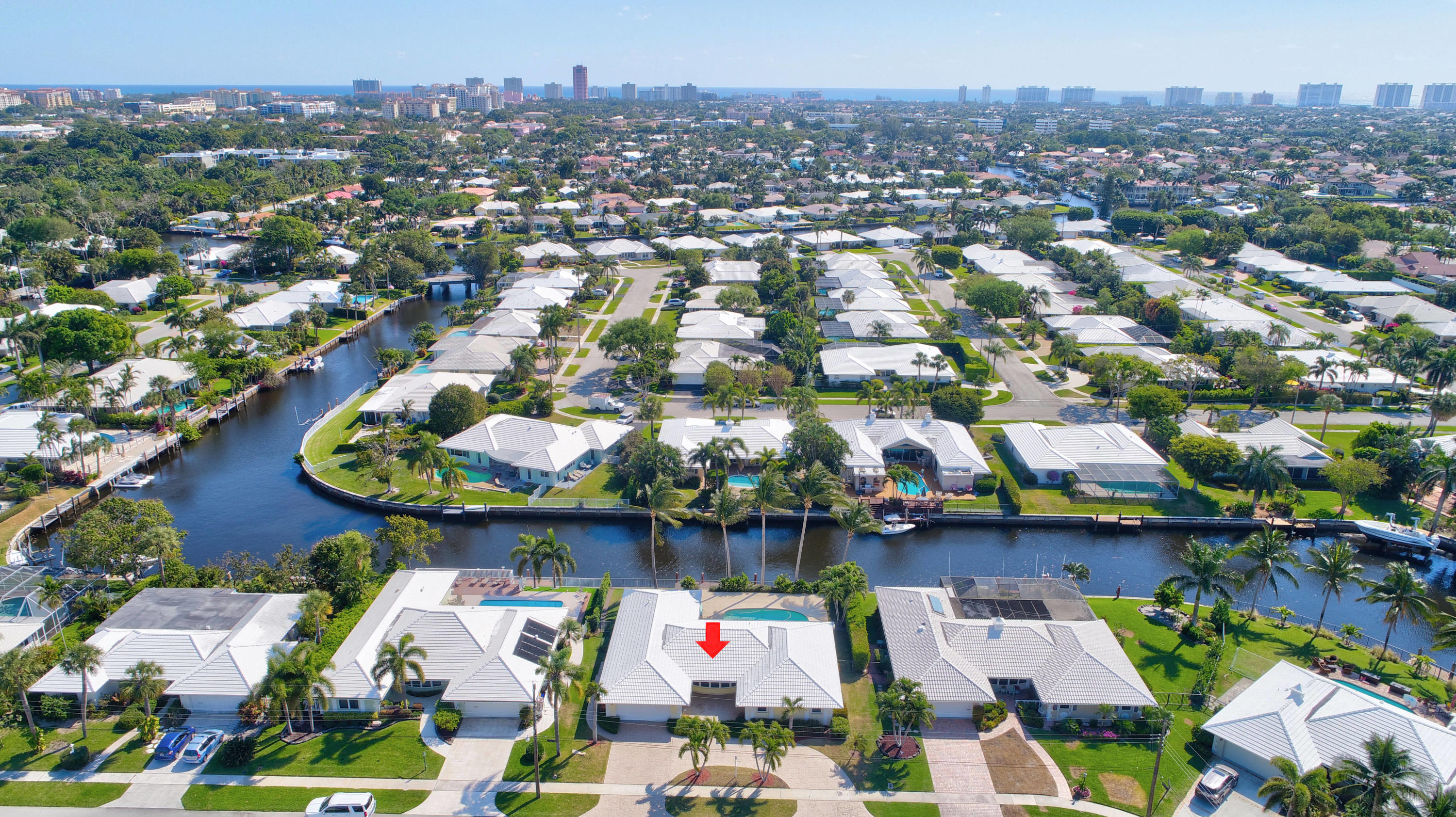 Beautiful one story 3 bedroom 2 bath with pool on water in Camino Gardens! Hurricane accordion shutters, circular driveway, plantation shutters, newer 4 ton A/C w/10 year warranty, newer stainless appliances,newer washer & dryer, boat dock, alarm, fenced yard, crown molding, built in bookcase, wood floors and boat dock are just some of the features of the house that make it so comfortable! Great floor plan! Quiet street! Tastefully redone!