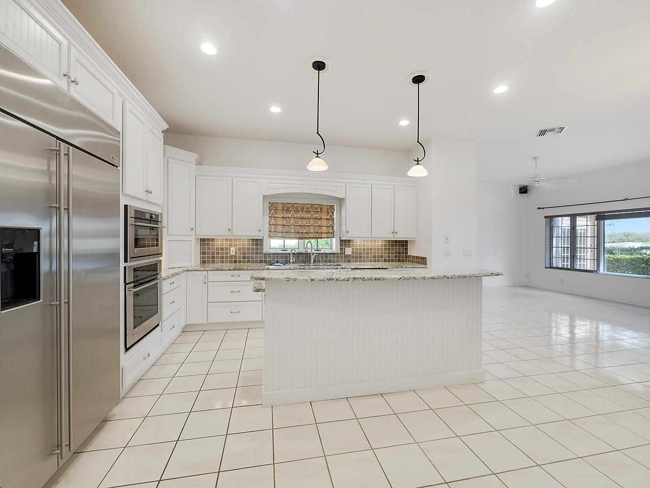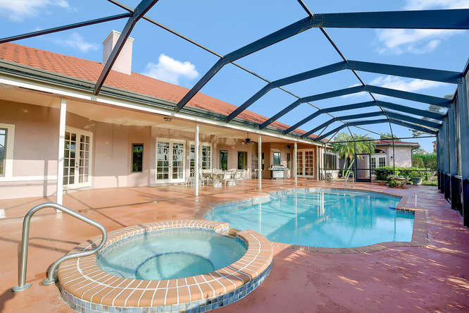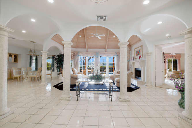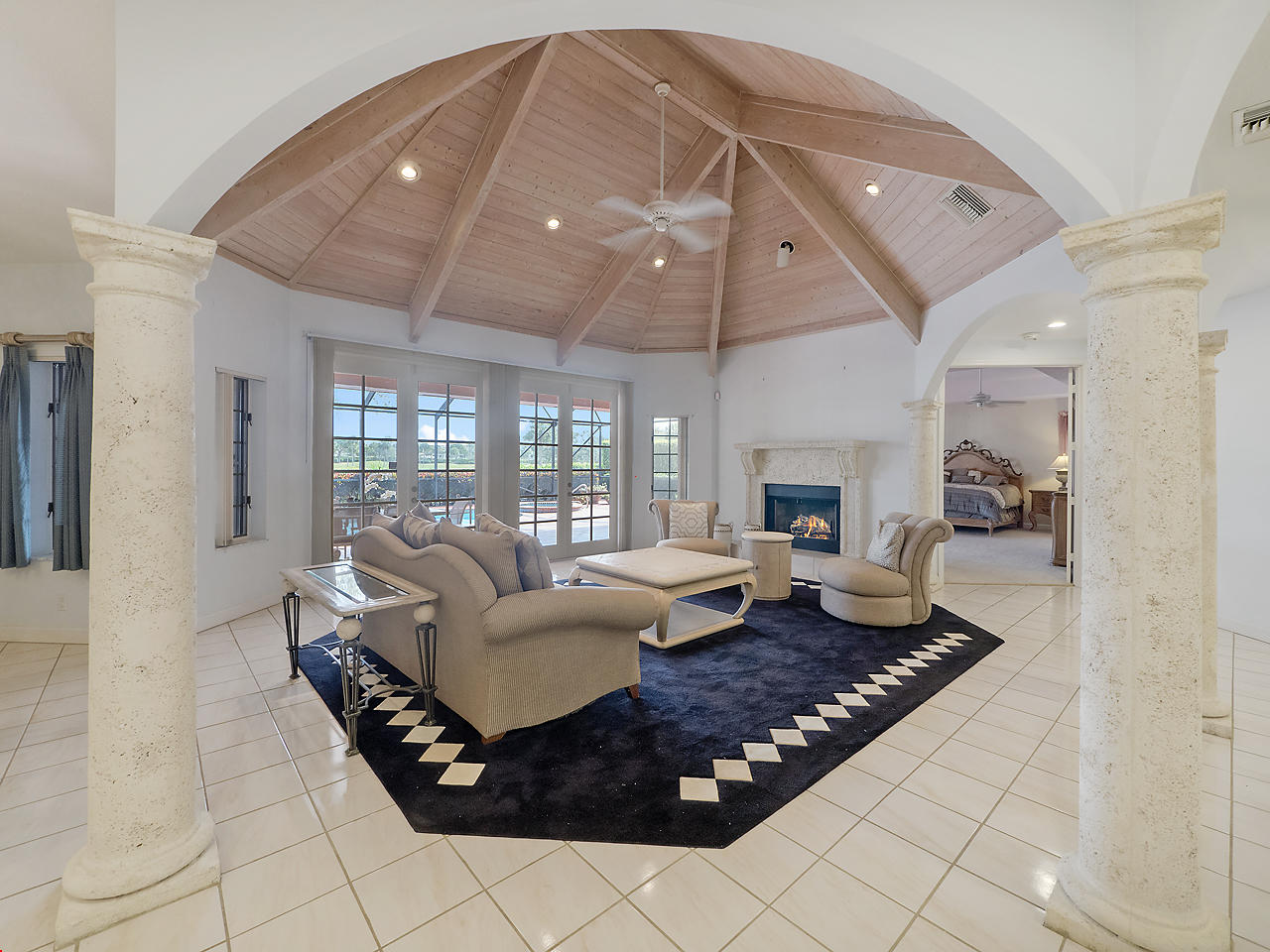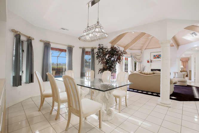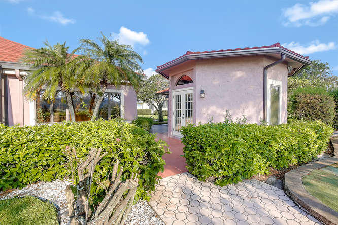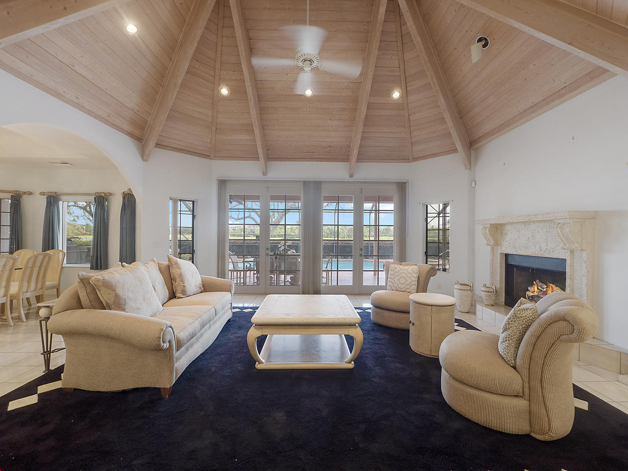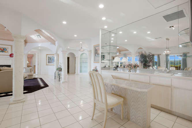 NO MANDATORY MEMBERSHIP! This 3 bedroom, 3 bath Bear Lakes Estate home with detached 1 bedroom 1 bath guest house is on a premium lot overlooking the lake on the 15th hole of The Lakes course of Bear Lakes Country Club. Ideal for entertaining, the entire home's layout focuses on the outdoor views of the course and water. Enter a formal foyer that opens to a living room with a wall of French doors, a fireplace and soaring open wood beam ceiling anchored by impressive Tuscan columns. The French doors beckon you to the expansive outdoor patio, pool and spa. There is a wet bar and formal dining area adjacent to the open living room. The kitchen has been remodeled with clean white cabinetry, granite counters, and high end stainless