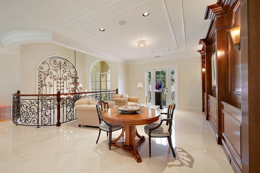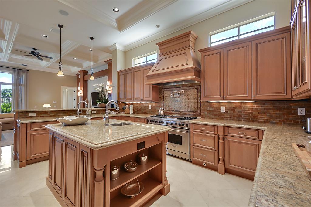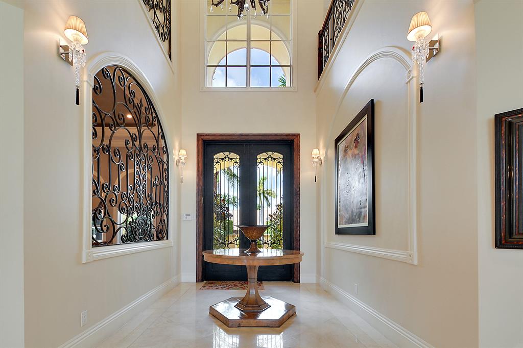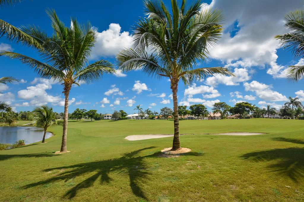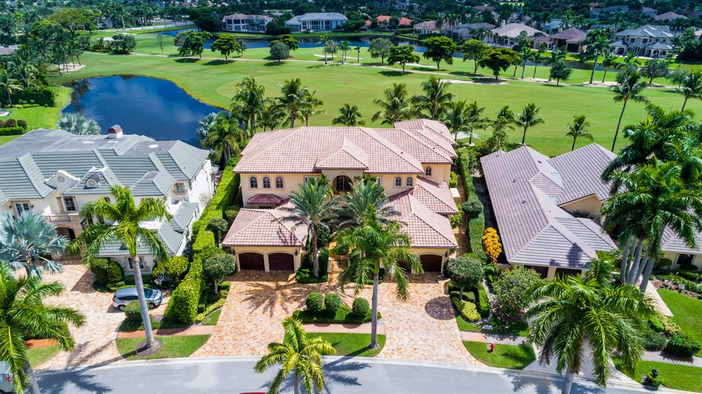 The epitome of sophistication and elegance, this beautiful classic Palm Beach inspired estate features a formal living room, dining room and gourmet chef's kitchen, breakfast room and large family room all designed for effortless entertaining or casual living. The master wing includes a grand master suite with luxurious his and her marble baths, generous closets and customized wood paneled library. An additional guest suite is located on main floor. Four en suite guest bedrooms, a home theatre and loft area, and additional laundry are on the second floor. An outdoor entertainment area is lushly landscaped with breathtaking panoramic golf course vistas and features a resort style pool, covered loggia and summer kitchen. Other amenities include hurricane resistant windows and doors,