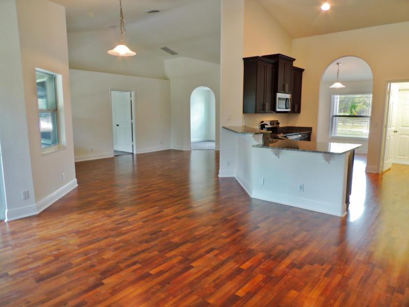 BRAND NEW CONSTRUCTION!! THIS GORGEOUS 3/2 WITH A DEN SITS ON 1.48 ACRES ON A CORNER LOT. THIS OPEN FLOOR PLAN HOME HAS IT ALL, CATHEDRAL CEILINGS, IMPACT INSULATED WINDOWS, 36 IN WOOD KITCHEN CABINETS, GRANITE COUNTER TOPS, STAINLESS STEEL APPLIANCES, SPLIT BEDROOMS, SPORT SHOWER, UPGRADED MOEN FIXTURES, LAMINATE WOOD FLOORS, PORCELAIN FLOORS IN BATHROOMS, WATER SOFTENER SYSTEM & MORE, A MUST SEE!