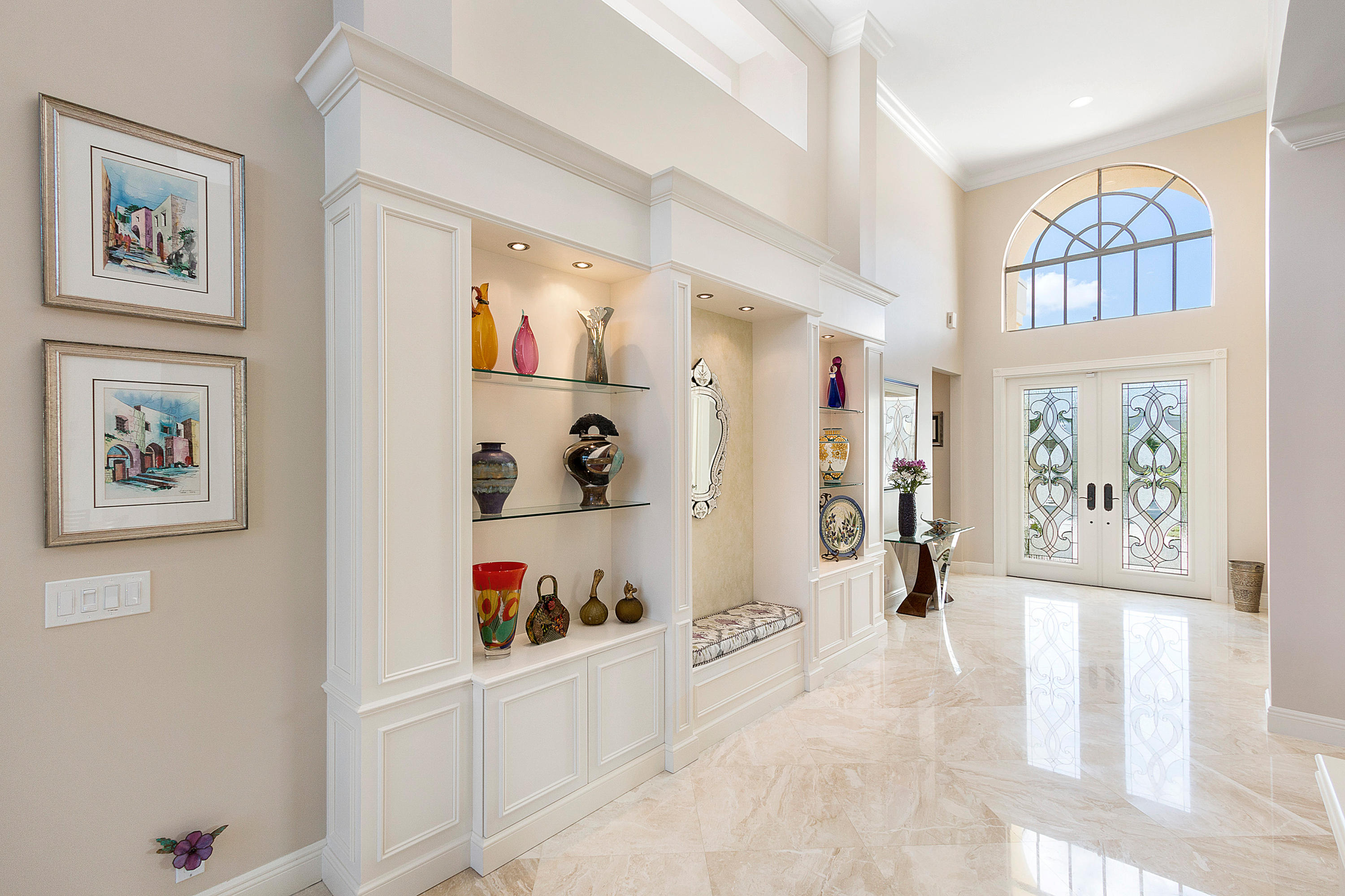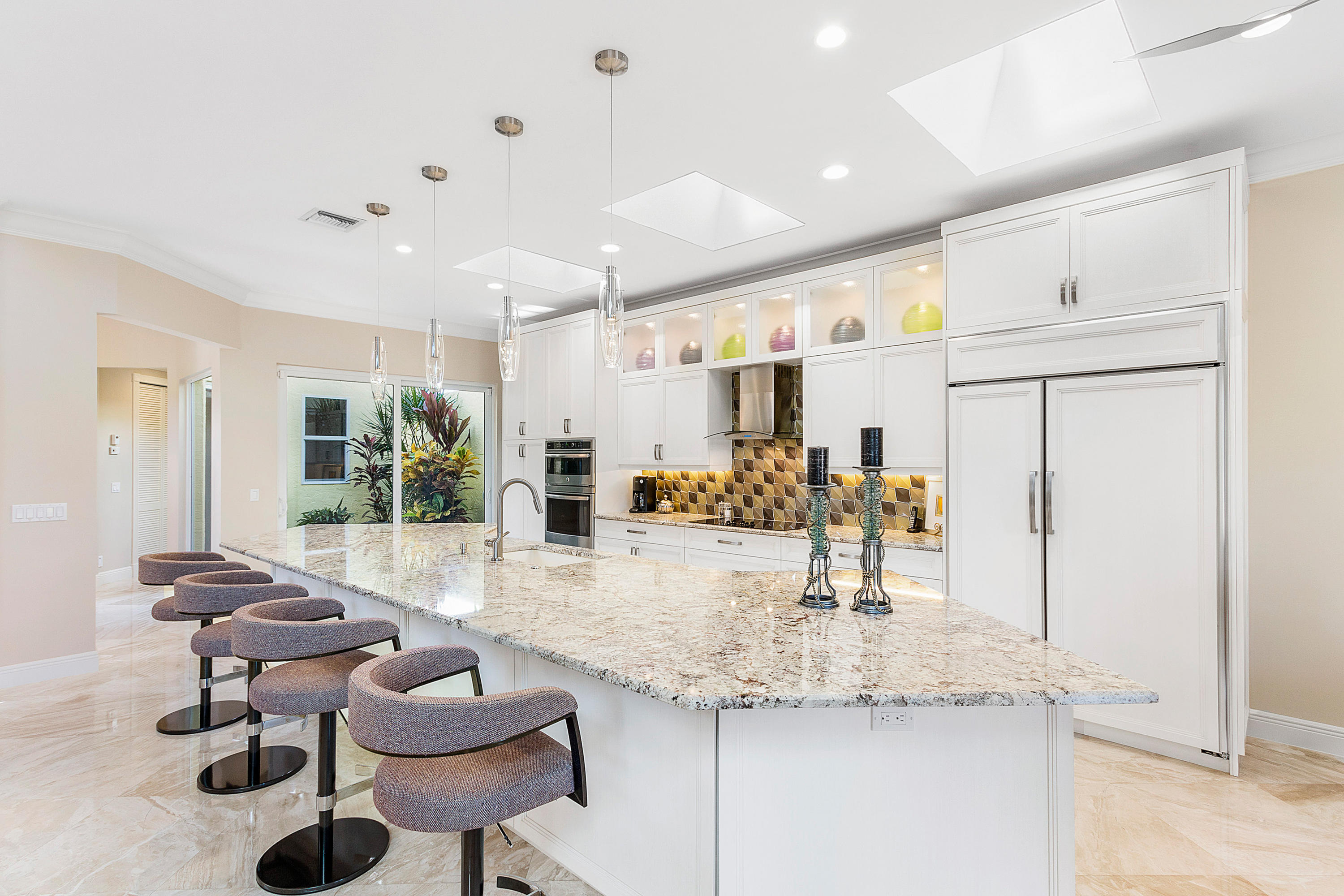 Upon entering this exceptional one story property you are immediately immersed by the open and flowing floor plan. Masterfully updated with no expense spared, you will find a spectacular custom kitchen that serves as the focal point of the home. There is meticulous attention to detail throughout with many designer finishes, extensive mouldings, 24 x 24 diagonal marble floors, numerous built-ins and gorgeous French doors. The culmination of these touches results in a particularly special space. Outdoor entertaining is ideal with vistas of the panoramic golf course and lake views surrounded by manicured grounds and tropical landscaping. Other significant improvements include impact glass windows/doors, new LED lighting, renovated bathrooms and more.