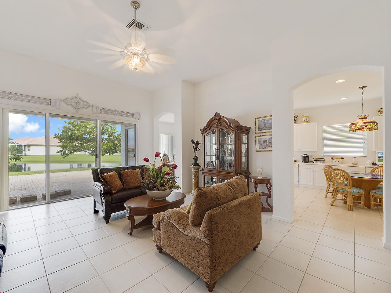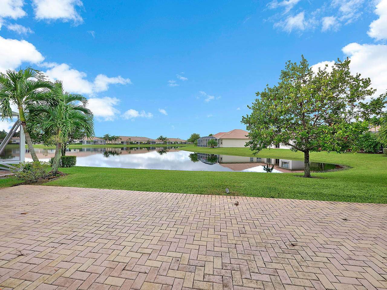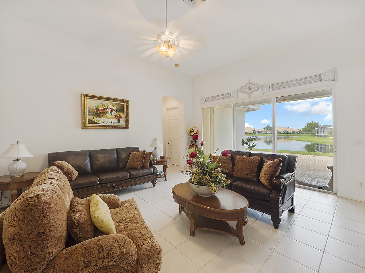 Beautiful home located in the highly desirable community of Baywinds! This 3 bedroom, 2 bath, 2 car garage Carlisle model is situated on serene, lakefront lot, and features tile flooring throughout the main areas of the home with laminate flooring found in the bedrooms, sizable eat-in kitchen with breakfast nook, and French door fridge. Generous master suite with two walk in closets, master bathroom featuring dual vanities and separate jacuzzi tub/shower, and pocked door for extra privacy. 12' Ceilings, and a nice, open floor plan. Baywinds is a premier 55+ community in South Florida and features wonderful clubhouse with tons of amenities and activities. Clubhouse features a card room, theatre, library, a kitchen for hosting events, exercise facilities, ballroom, and a meeting room,