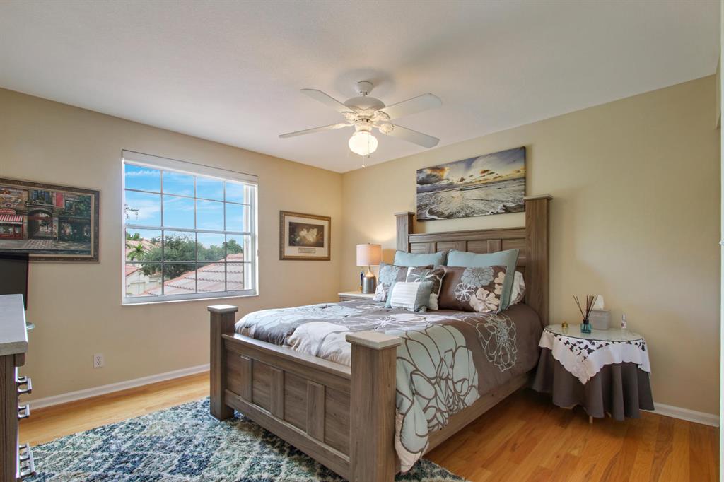 Beautifully updated townhouse located on a private tranquil setting with no back neighbors. Bright open floor plan offers stunning custom totally updated top of the line granite and stainless kitchen with built in breakfast bar. Warm honey hued real wood floors. Spacious great room opens to east facing screened patio perfect for added outdoor living space. Master bedroom offers impact glass, custom walk in closet and beautiful updated bath with dual marble vanity and spacious tile shower. Two guest bedrooms with updated bath. Just steps to the fabulous clubhouse boasting tennis, heated pool and spa, tot lot and fitness room. 1CG plus 2 car paver driveway Close to shopping, restaurants, Turnpike and I95. Full accordian shutters throughout. Great schools. Pet friendly community.