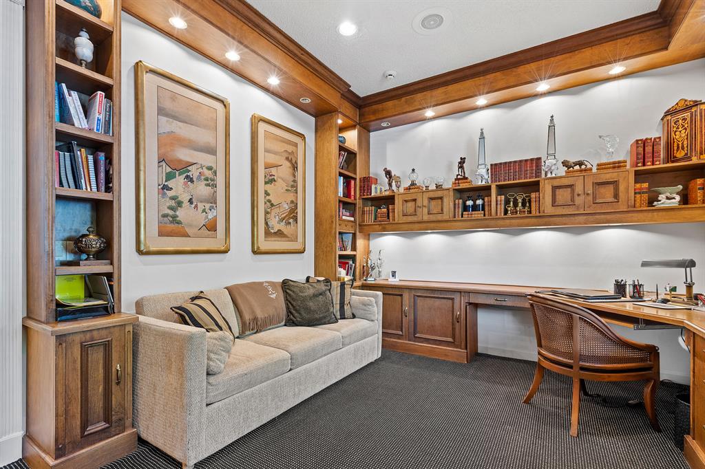 This striking showplace has been updated to create a neutral pallet of style. Entering into the gallery foyer you are greeted by impactful two-story ceiling heights. Entertaining is made easy with the spacious professional bar and living room that opens to the private pool and sun deck area. The remodeled kitchen features a sleek dine-in island that extends into the adjacent family room that offers stunning custom floor-to-ceiling built-ins. The first floor level of living is highlighted by a built-in office that also serves as a second bedroom in addition to the master on the first floor. The oversized master retreat is poolside and offers both his/hers private remodeled bathrooms and large walk-in closets. Two, large in scale additional bedrooms located upstairs are both en-suite and