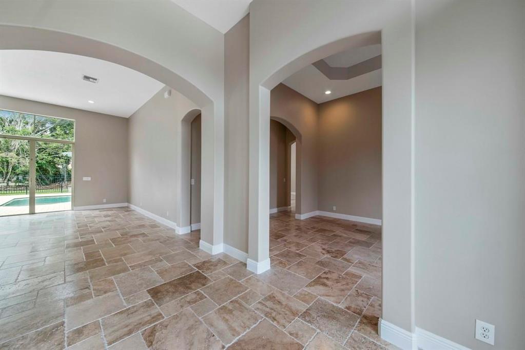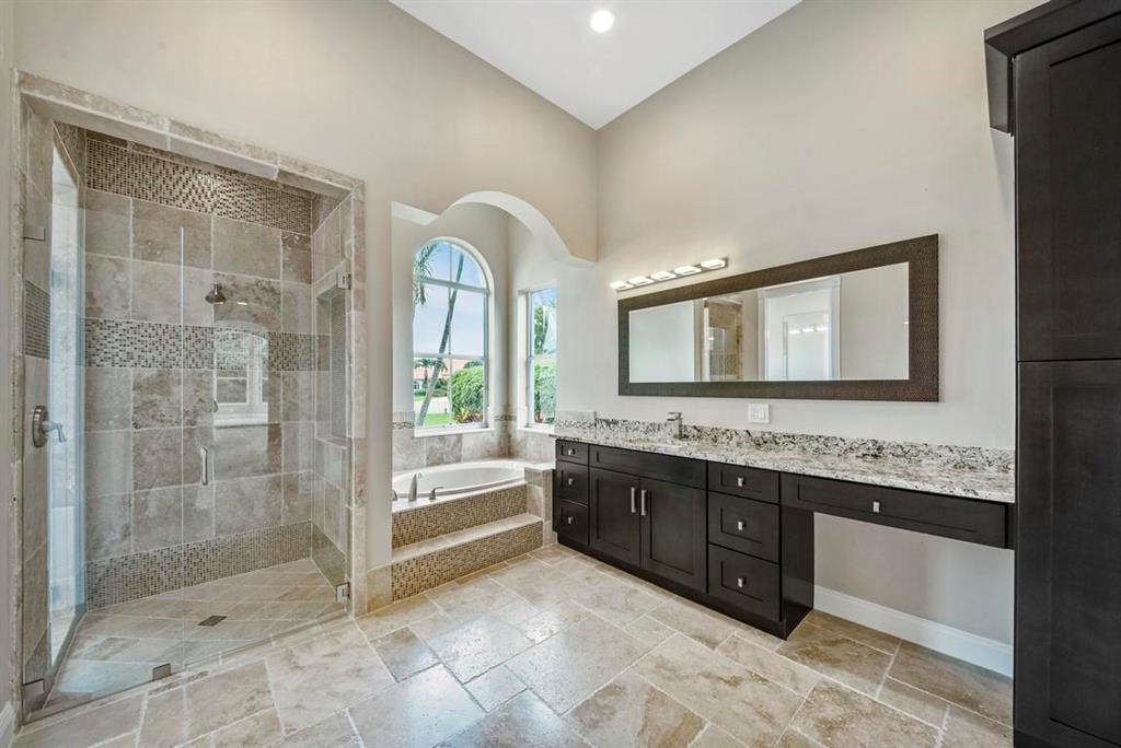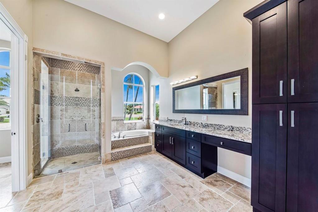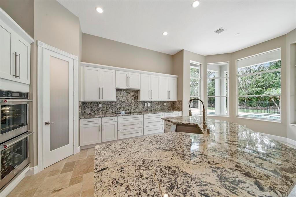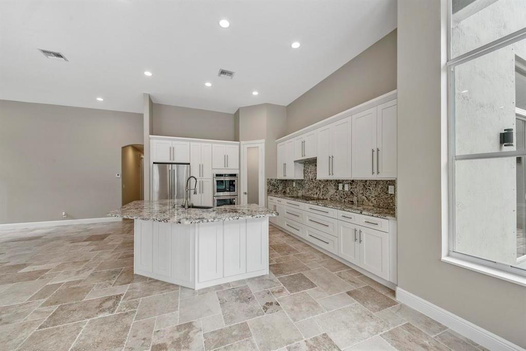 This custom home is a sophisticated and luxurious retreat that reflects attention to design and detail. From the moment you enter through the etch glass doors you will notice the Travertine flooring and the abundance of natural light. The stunning designer kitchen will inspire your inner chef with granite countertops, full granite backsplash, classic white cabinets, stainless steel appliances, double oven, a snack bar and family dining area. Luxurious master retreat features a coffered ceiling, sitting area, slider to patio and walk-in closet. Master bath has dual sinks with granite countertops, a soaking tub and a walk-in shower. Enjoy the Florida lifestyle in your oversized backyard with a covered patio, pool, spa and tropical landscaping. Country Club living without the dues.