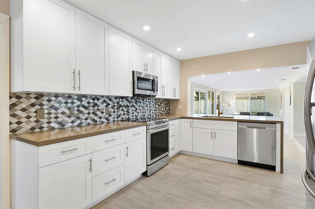 Welcome home to a true 3 bedroom 3 bath professionally designed & decorated spacious home in the heart of Boca Square. Brand new 24x24 porcelain tile & Wood Style tile floor in each bedroom. Retro-fit recessed lighting. Top of the line Samsung kitchen appliance package. Solid maple wood kitchen. All cabinets equipped with soft closing doors & drawers. Ample amount of counter space atop of new wave quartz counters with ''waterfall'' end feature & under-mount stainless steel tub sink. Custom built-in wine refrigerator. Updated bathrooms complete with solid maple vanities & undermount sinks. Inside full laundry with brand new washer/dryer. Freshly painted inside & out. Professionally landscaped