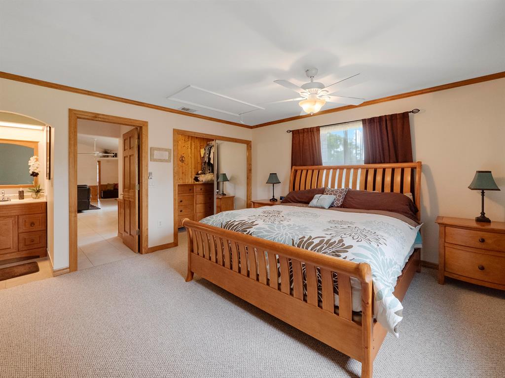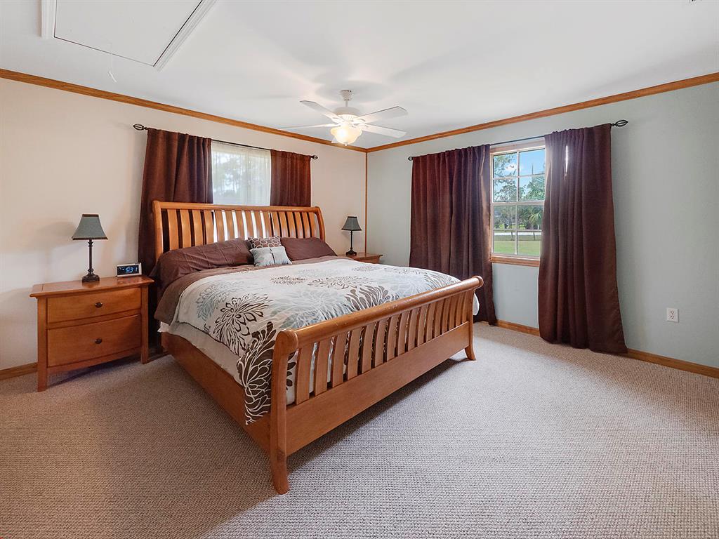 Spacious, open floor plan with cathedral ceilings in this well maintained home. Features a split plan layout, updated kitchen with corian style counters, 42'' maple color cabinets with crown molding and stainless steel appliances, ceramic tile and wainscoting accents throughout living areas new berber carpet in bedrooms, 1.33 acres with a large storage shed, newer AC, newer windows, hardie board exterior, new exterior paint, spacious master suite with walk-in closet. French doors open to a large covered porch with ceiling fans and tongue and groove wood ceiling. Plenty of room for boat and RV parking. Home is well maintained and contractor owned.