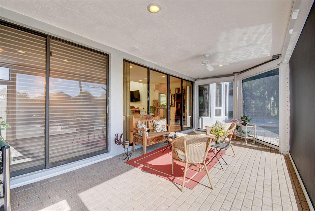 One story home on over-sized lot boasts pool, shuffleboard court and golf view. This house has 2 bedrooms plus a convertible den/office or 3rd bedroom, 3 full baths and large screened in porch with electric roll up panels. These state of the art screens are the newest innovation in hurricane resistance and protect the rear of the house. Also, 2/3 of the windows upgraded to impact glass. No need to take the car to the club, Steeplechase is the only subdivision to have a private access walkway to the club. Club Membership is required.