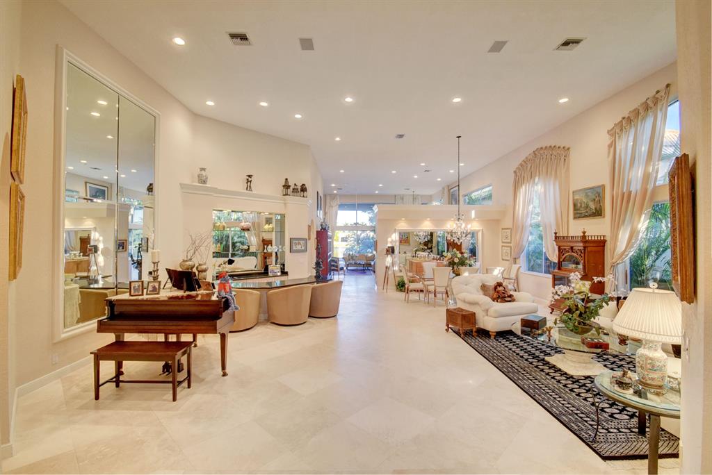 A very special home - one-story with a pool on the lake! Enjoy spectacular lake views the moment you enter this immaculate one-story 3 bedroom/3 bath home featuring volume ceilings; Saturnia marble floors, a Living Room wet bar; an open island kitchen with white 42'' cabinetry & corian counters; spacious Master Suite offering custom configured walk-in closets & marble Master bath with 2 commodes; built-in desk & shelves in the third bedroom; sold core doors & central vacuum system. The patio area offers covered & open areas and a pool overlooking the lake. There are accordion hurricane shutters along the back. The roof is about 8 years old & has a special neoprene sheet under the tiles for additional protection. The A/C systems are about 8 years old; washer & dryer about 3 years old.