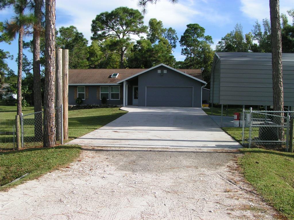 Open,Airy & Bright 3/2/2 on 1.29ac. Enjoy the Acreage lifestyle - bring all your toys and pets. Impact windows including garage door & skylight, new water system enclosed for weather protection & longevity, gutters, updated master bath, fully fenced, elec. gate. A/C - 2015. Keyless pedestrian garage door. Freshly painted interior. Huge metal carport (2016) ( 25w X 30L X 14H ). No Pond. Lovely, well kept property. Huge, country rear porch. Extended concrete driveway including carport. Elementary and Middle Schools accross the street!!!