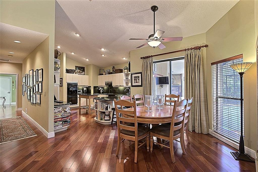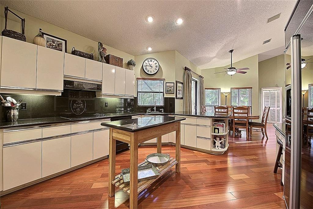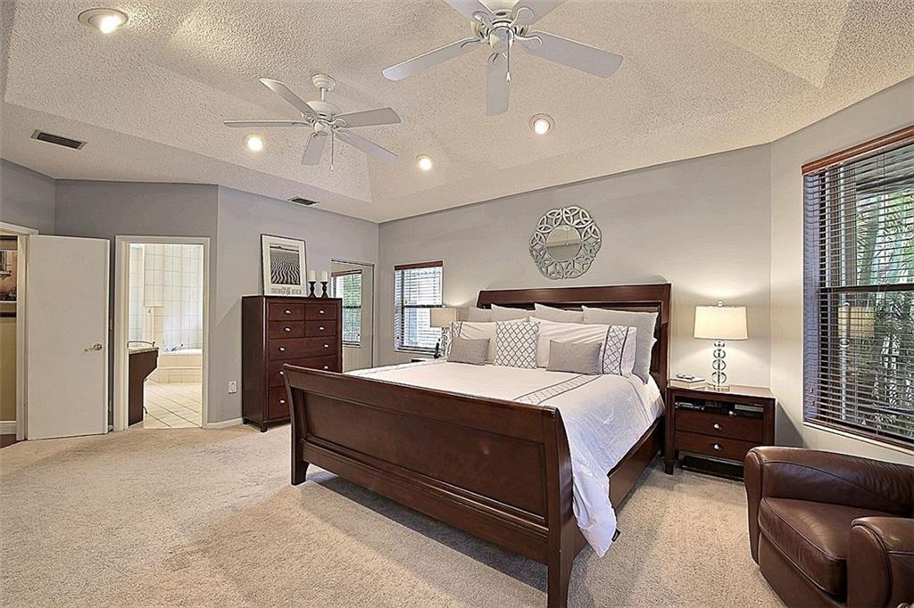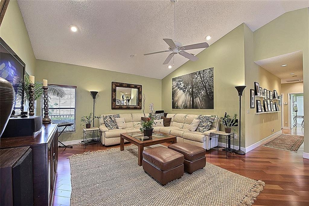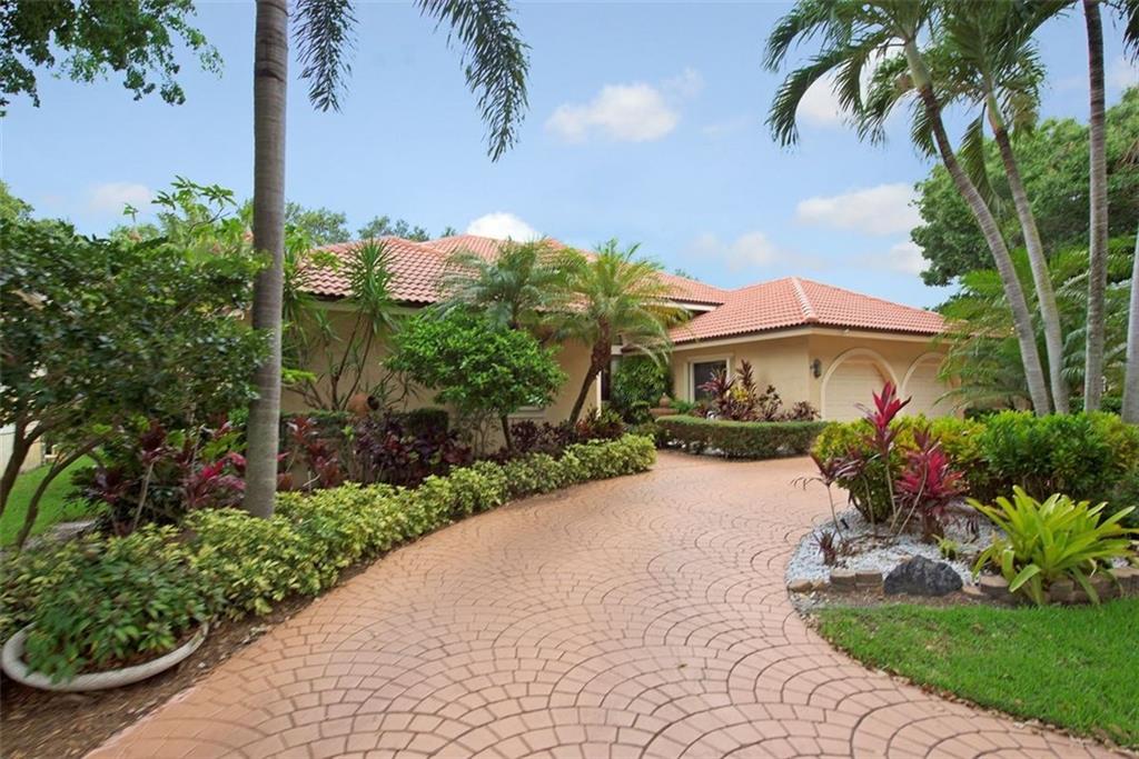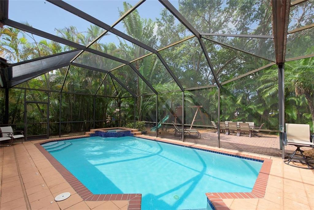 Tropical paradise on quiet park-like cul de sac. Contemporary architecture, high flat and cathedral ceilings with transom glass windows. Accordion hurricane shutters and newer 2006 roof. Two zone A/C and water heaters. Updated kitchen and baths. Gorgeous cheery wood floors throughout living areas. Large bedrooms in desirable split bedroom floor plan. Heated pool and spa, completely screened and fenced. Open playground, deck and built-in BBQ. Fabulous guard gated community with great amenities.