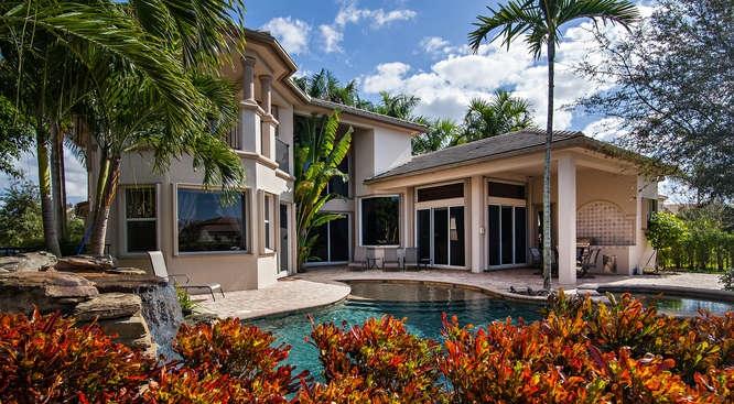 Exquisite Mediterranean home within the gated community of Wellington View with spectacular views of the lake. $100,000 in builder's upgrades. Will sell unfurnished. Resort style pool, spa and waterfall. Master bedroom suite is on the main floor and features walk-in closets. Luxurious master bathroom adorned with spa tub and custom appointments will have you feeling as if you're on a spa retreat.