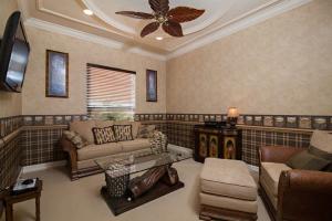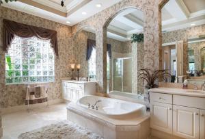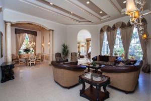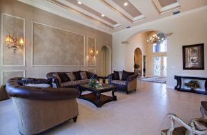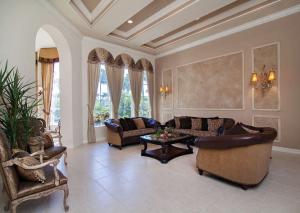 Splendid and spacious 3 bedrooms, 3.5 bath Florida architectural home with office/den has everything an entertaining family would enjoy. The double glass door entry opens to the spacious formal living room with crown molding, lighted niches and coffered ceilings. Well-appointed dining room features coffered ceiling, and elegant details. Family room features windows galore, and custom built-ins. Open to the family room, the gourmet kitchen offers granite countertops, upgraded wood cabinetry, pull out drawers, built-in ovens and spacious center island. The master suite offers dual closets; master bathroom includes double vanities, granite countertops, and Roman tub. Lush outdoor landscaping surrounds the custom heated pool and spa. Covered loggia is perfect for entertaining.