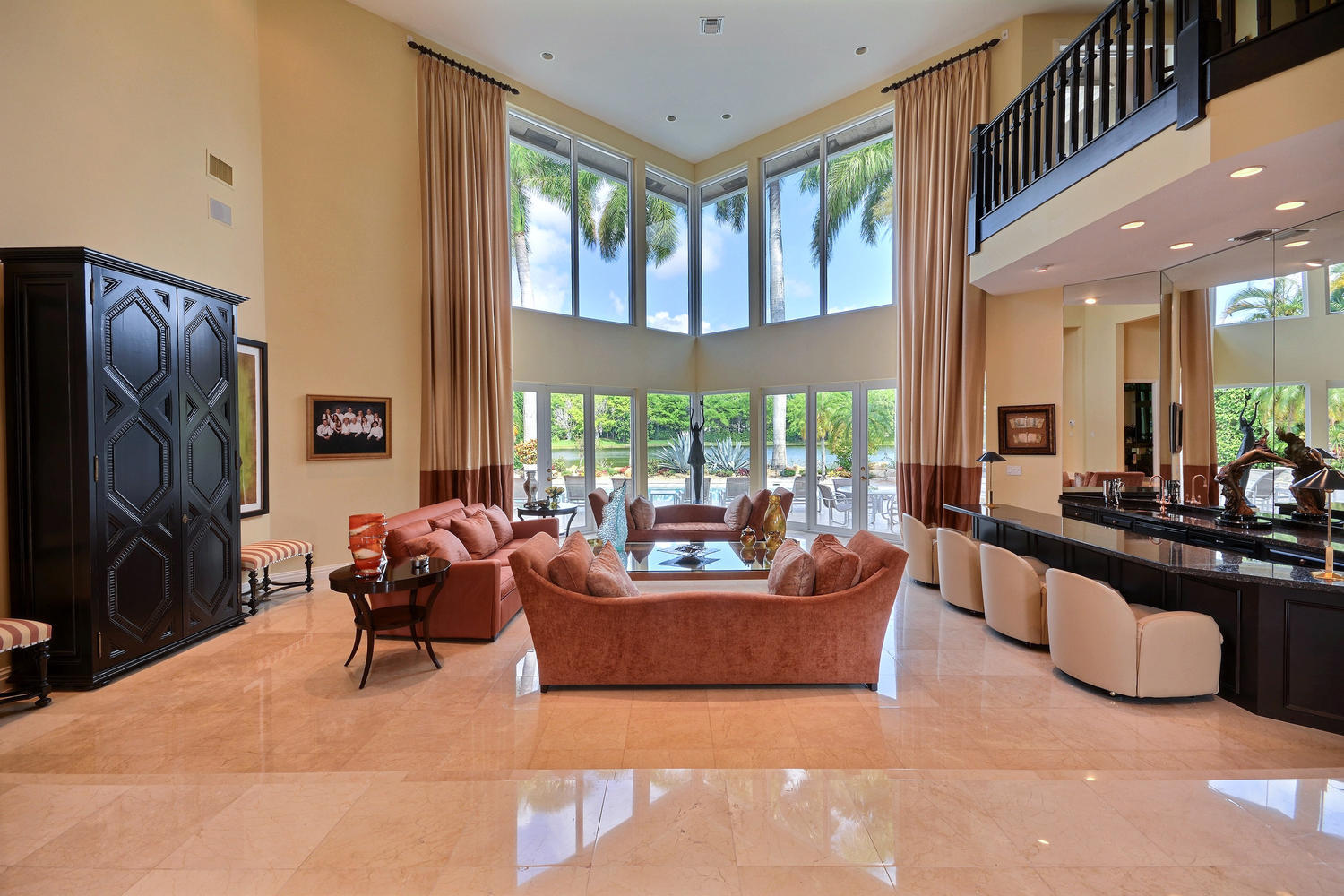 Incredible two story estate located on a spectacular lake front property with approximately .41 acre on desirable cul de sac. Dramatic formal entry leading to living room & dining room, large office with built-ins, gym, spacious master suite and one additional en suite bedroom downstairs, kitchen overlooking breakfast area & family room leading to a screened loggia and large resort style pool. Loft style game room and 5 additional bedrooms upstairs. Partial impact windows. The information herein is deemed reliable and subject to errors, omissions or changes without notice. All measurements are approximate.