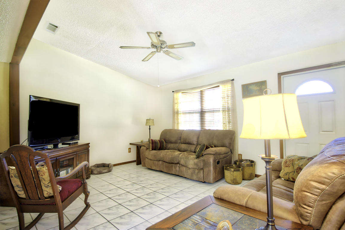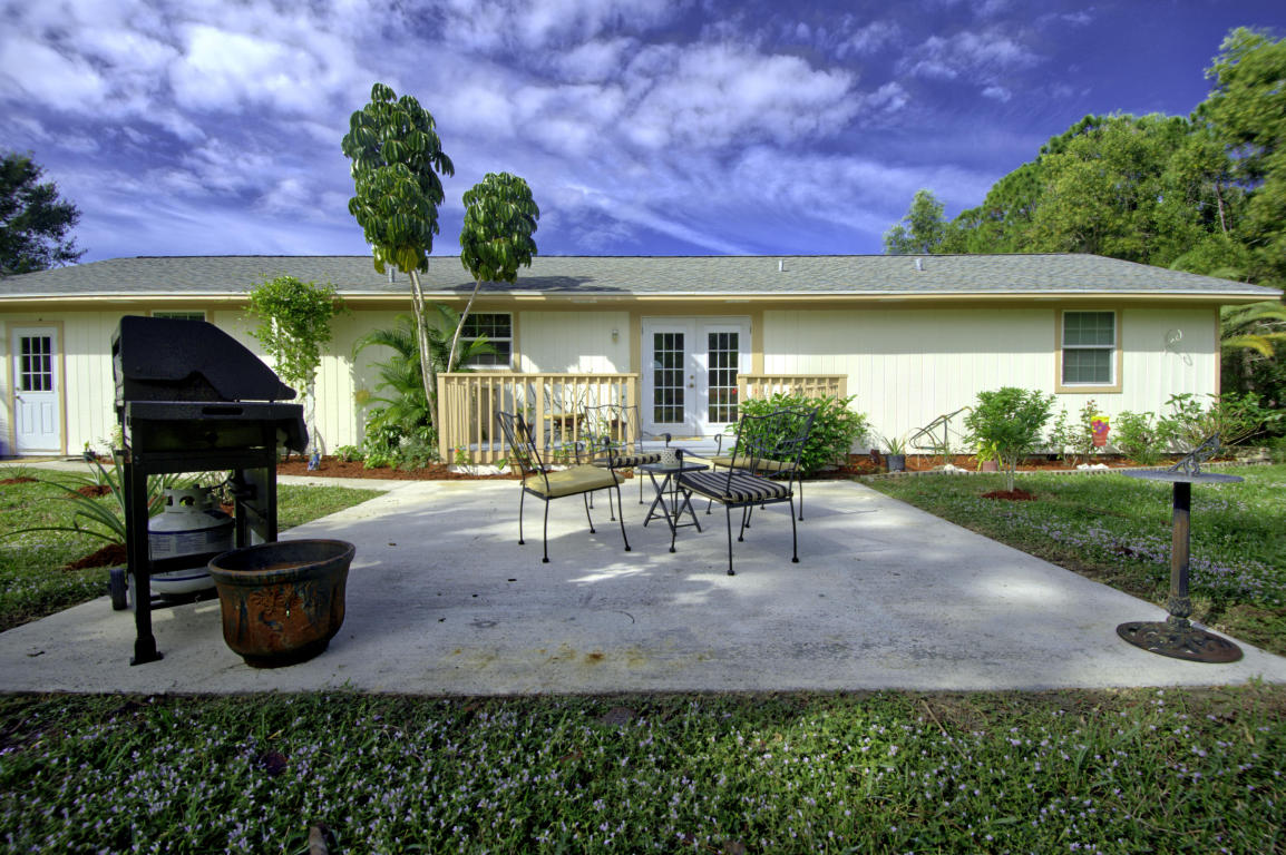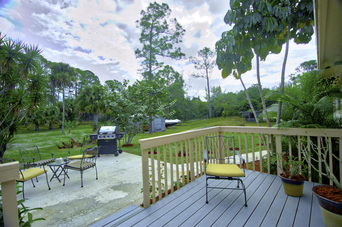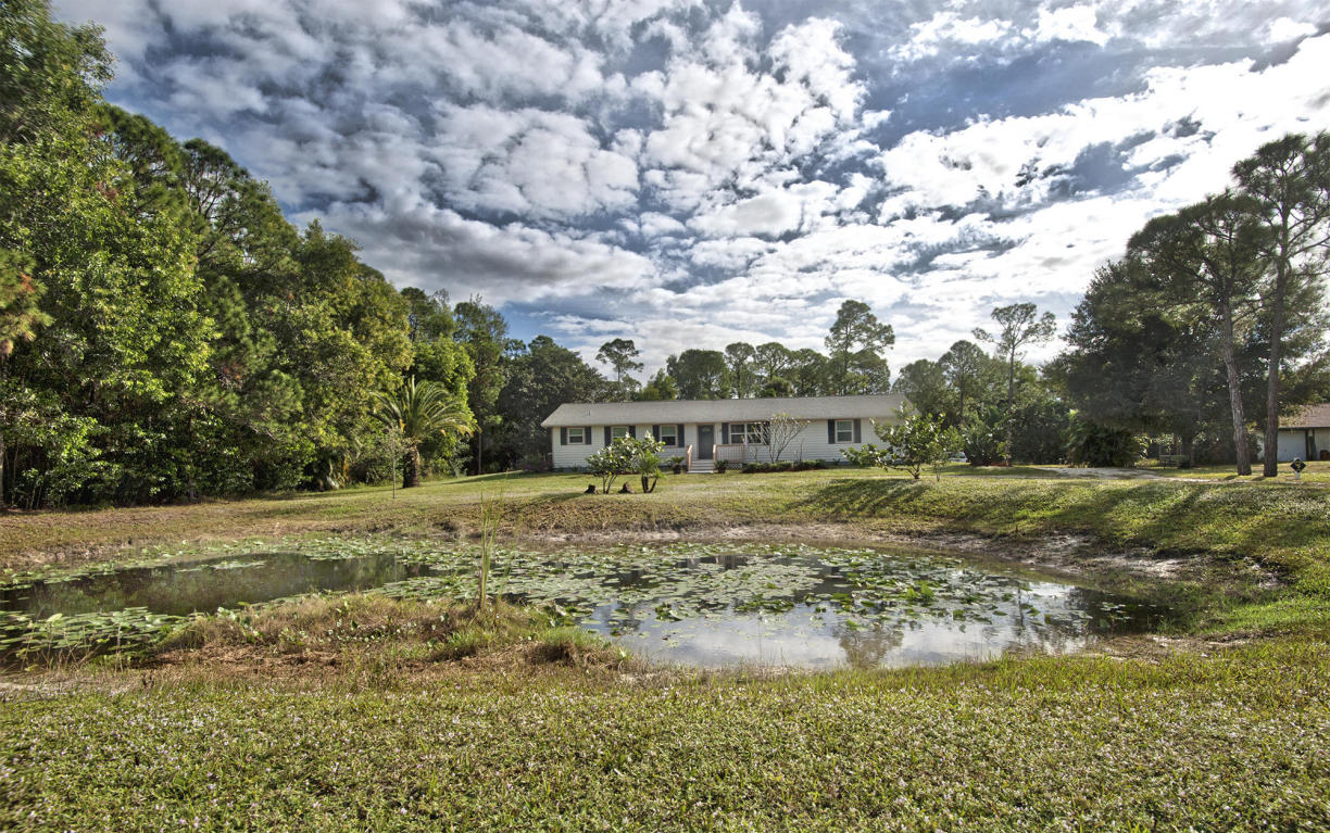 This light and bright, charming 3/2 with oversized 2 car garage on huge 1+ acre lot is located on a quiet street. This lovely home has a canal all along the east side of the lot that provides plenty of privacy. There is a delightful pond in front. This wonderful home features two decks, one at the front entry and in back, overlooking the large yard. The living area has a vaulted ceiling, tile floors and french doors leading to the outside entertainment area. The kitchen opens to the sunny dining room. The master suite is generously sized. New composite decks in 2015. Fresh paint. New roof 2005. Lush landscaping. Room for pool and/or extra building. Own your own piece of paradise today!