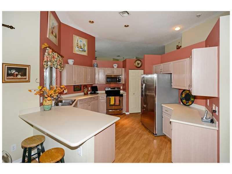 Beautifully maintained home w/huge dome screen, pool & amazing views of lake from all living areas & master suite. 3 way split floorplan, 12 ft. volume ceilings in living areas, kitchen w/corion counters, newer stainless appliances & opens to huge familyr m, master suite w/sitting area, his & hers closets, master bath, roman tub, stall shower, separate vanities. Laminate flooring throughout, accordion hurricane shutters & impact transom windows. Grand double door entry opens to amazing view of lake. No HOA