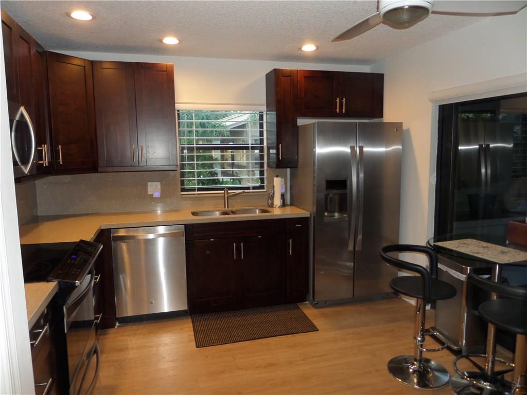 BEAUTIFUL CONTEMPORARY SINGLE STORY COMPLETELY $70K REMODELED FLOOR TO CEILING. NEW $18K HURRICANE IMPACT WINDOWS/SLIDERS THROUGHOUT-- NEW LAMINATE FLOORS THROUGHOUT, NEW KITCHEN & BATHROOMS W/QUARTZ COUNTER TOPS, NEW FANS&HIGH HATS. NEW $5K CARRIER HIGH EFFICIENCY A/C, POPCORN CEILING REMOVED, FRESHLY PAINTED, NEW HUNTER DOUGLAS BLINDS, PRIVATE GARDEN VIEW W/LARGE PATIO, MOVE-IN READY PERFECTION! NOTHING LEFT TO DO IN THIS UNIT. WILL GO FAST. (55"PIONEER PLASMA TV INCLUDED) DEL PRADO ELEMENTARY DISTRICT