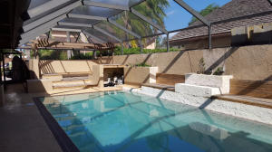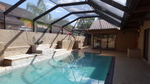 Beautifully updated and recently painted 3BR/2BA unique one story Mediterranean home with secluded pool with a tremendous entertainment oriented patio area with party seating that surrounds the pool Terra cotta tile floors & new carpeting in Bedrooms. Wood beamed ceilings and a Built-in wet bar, new kitchen cabinets/counters. Upgrades abound. Master walk-in cedar closet. Decorative wood burning fireplace in family/living area. New 2 car Hurricane rated garage doors with automatic door opener. Large screened enclosed pool patio with new wood deck & new pool equipment. Newer dual zoned central HVAC system. Patios Del Mar II is a non-gated community. Dues cover common grounds & basic cable.
