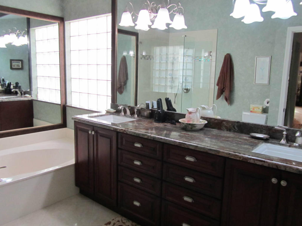 Gorgeous one story pool home in popular Palms community. No detail left undone. Floor plan features a living room plus family room and over sized 3rd bedroom. Home is situated on a serene lake view with a heated pool in the very private backyard. The roof and A/C have been replaced. The kitchen has custom light wood cabinets, granite counters, glass mosaic back splash and stainless steel appliances. Both bathrooms have been updated with dark wood cabinets, marble counters and replaced toilets. The master bath has a seamless shower door and large tile with decorative border, high wood cabinet with drawers plus a framed mirror over sinks and tub. Master bedroom has custom carpet, beautiful view of pool and a large walk in closet with custom wood built ins with many shelves.