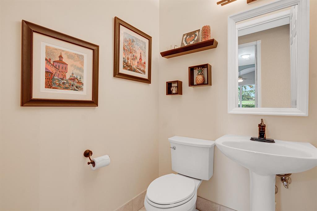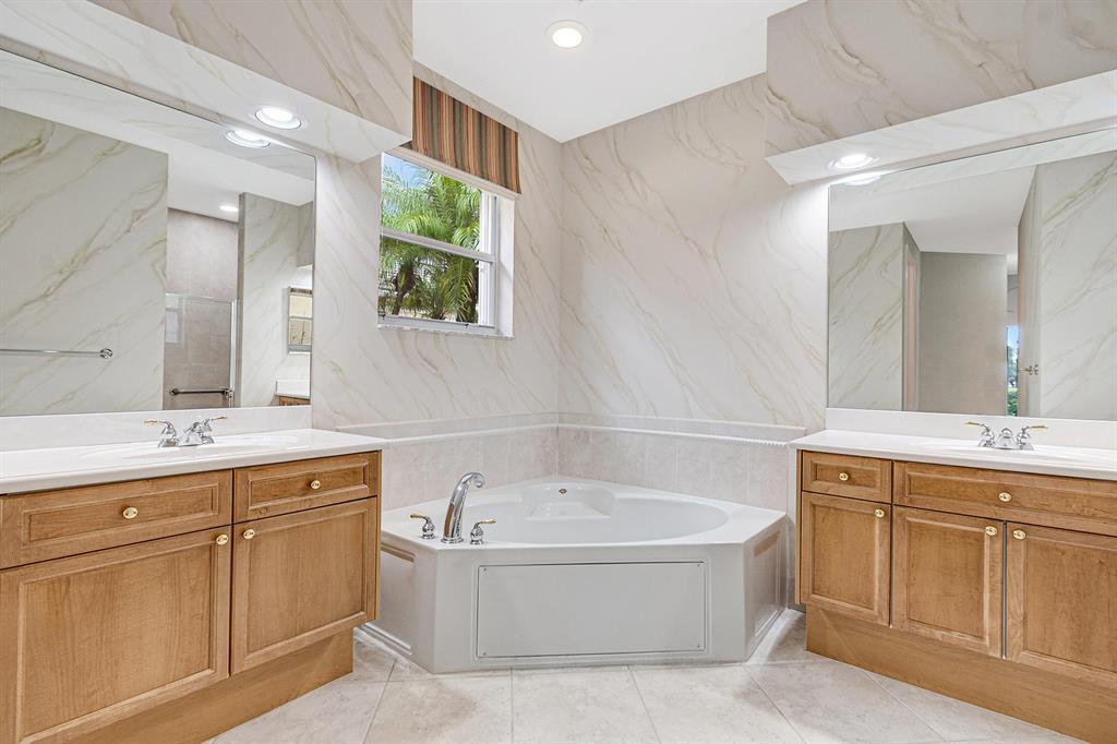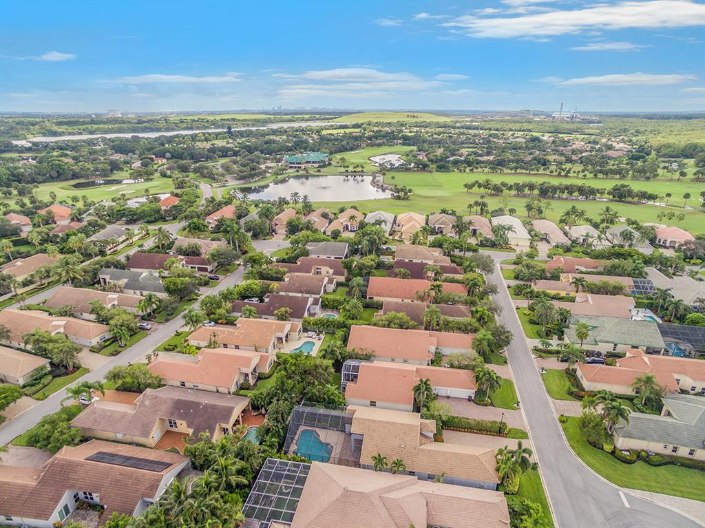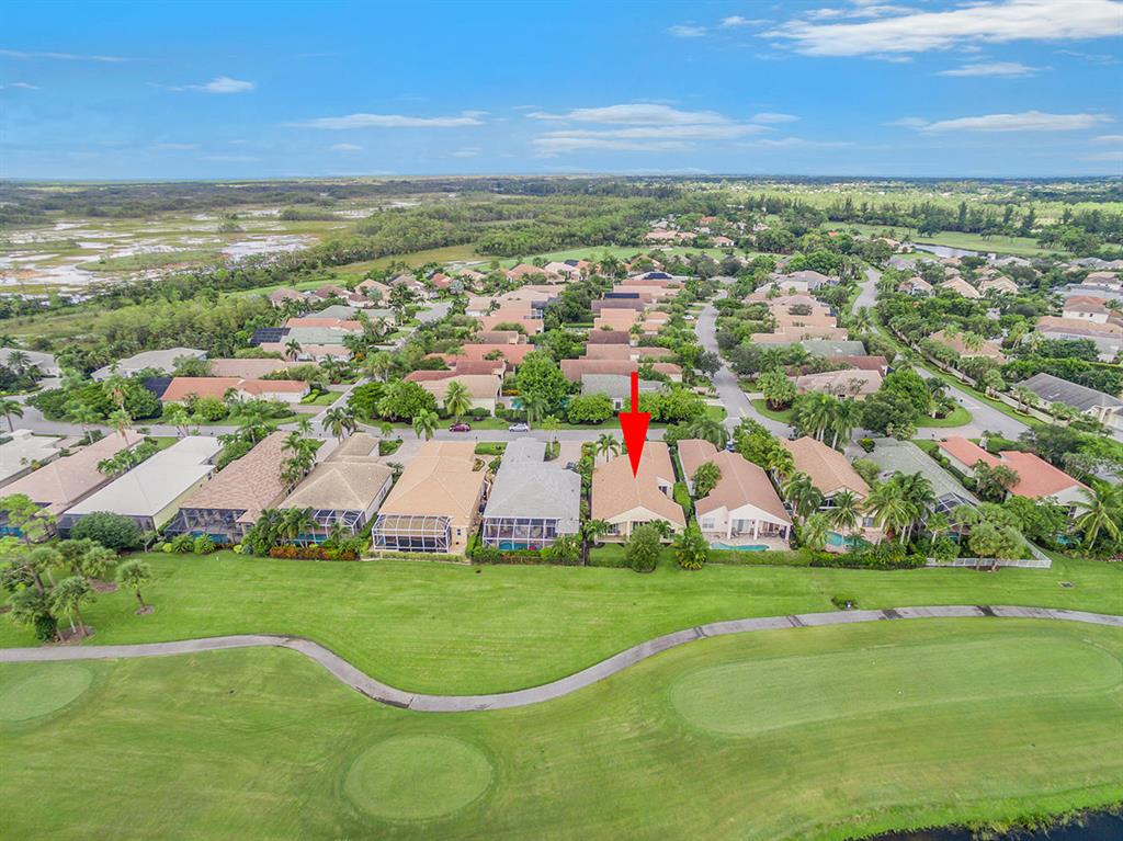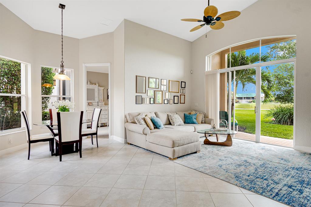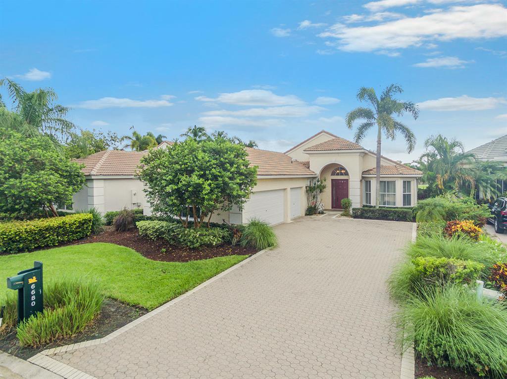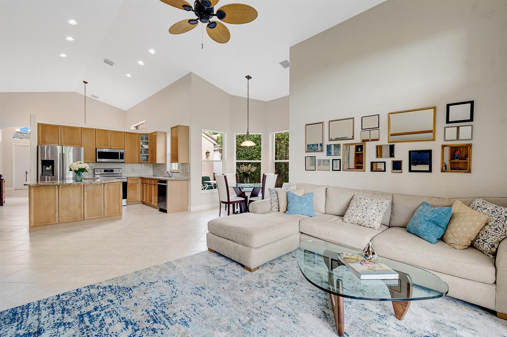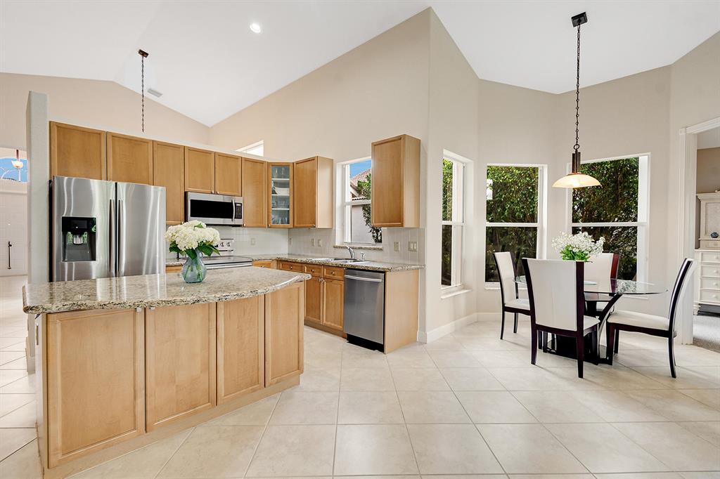 An elegant single family house situated on the 1st hole of the award winning Arthur Hills designed golf course. This bright, open home features cathedral ceilings, a split plan that has plenty of living space and options to even add a 4th bedroom. The house has a formal dining room, a den/ office, a family and living room. The spacious main bedroom has sliders to the patio with lush landscaping and spectacular views of the golf course, a large walk in closet, dual sinks, tub and walk in shower. The updated kitchen has stainless steel appliances, a granite island and breakfast nook, A move in ready house, great family and entertaining setup. There is an additional interior patio off the kitchen and guest bedroom, perfectly suited to enjoy the outdoor south Florida lifestyle. Experience the