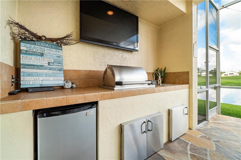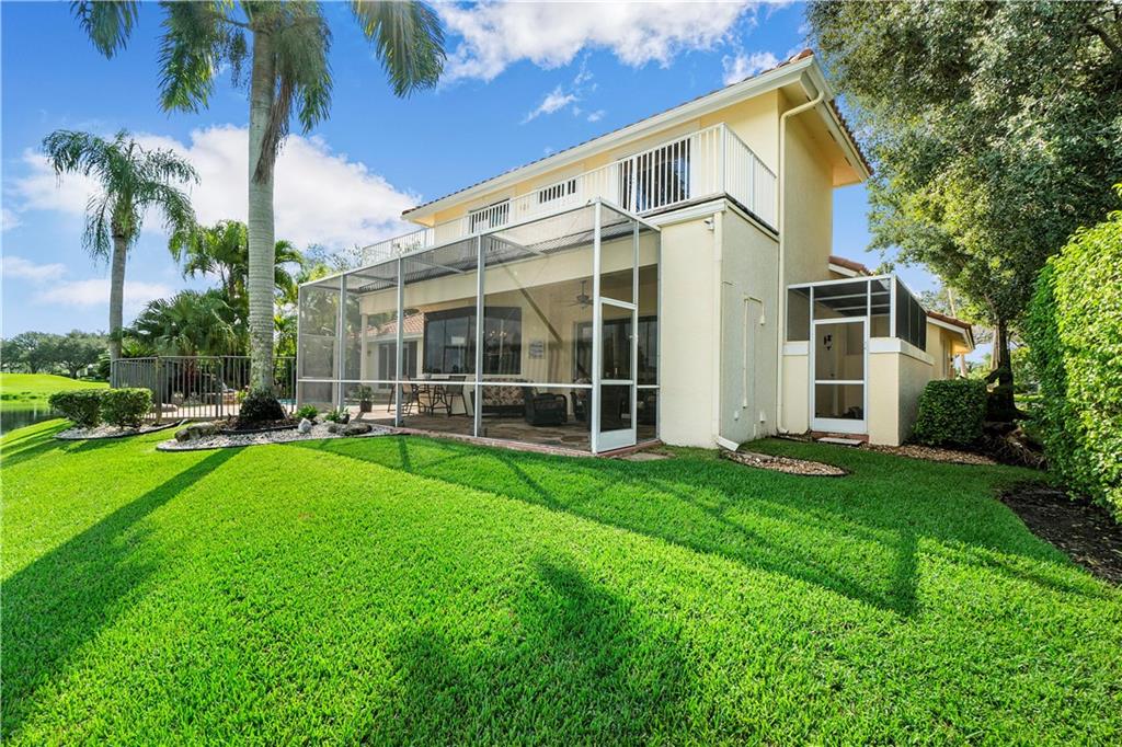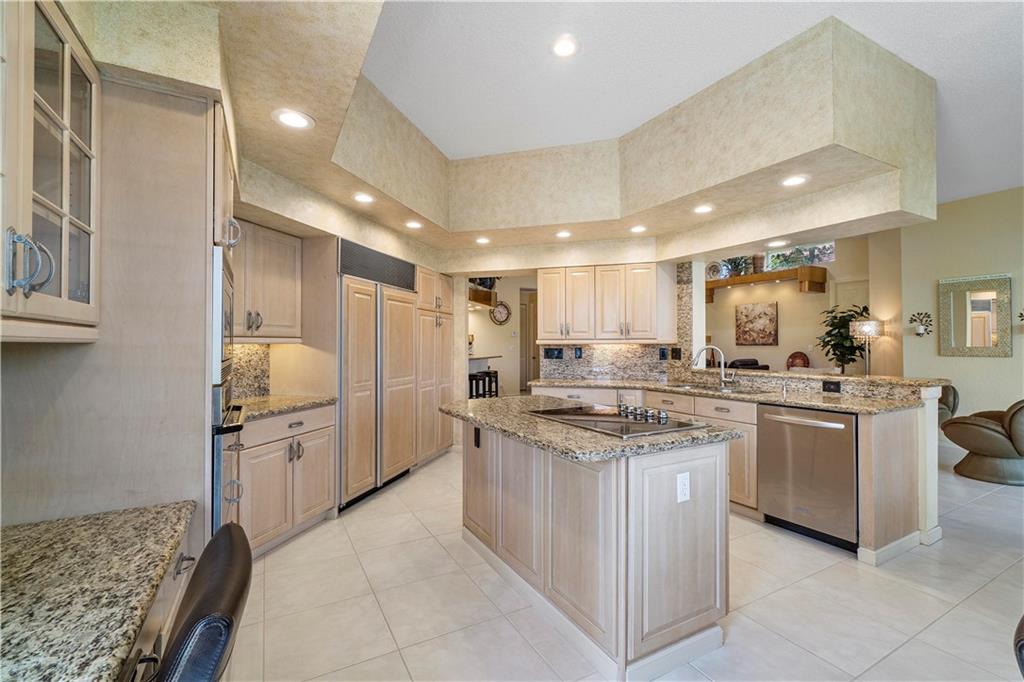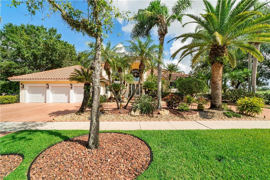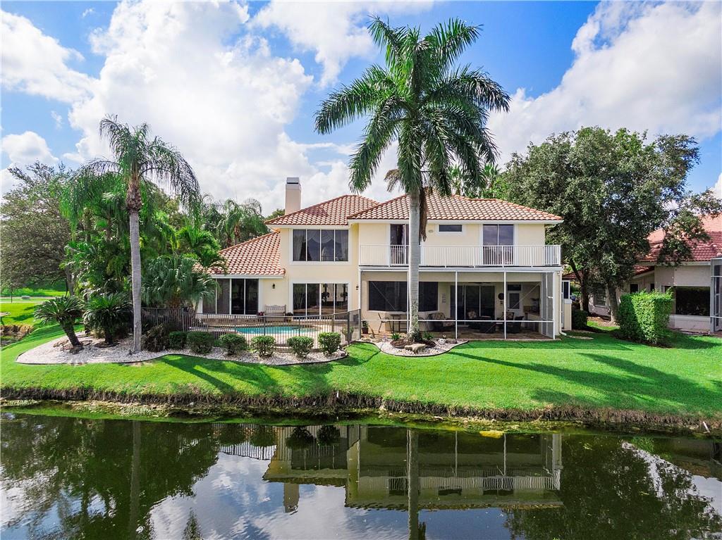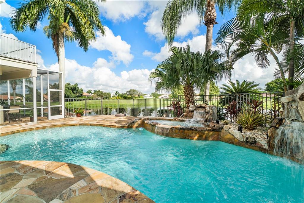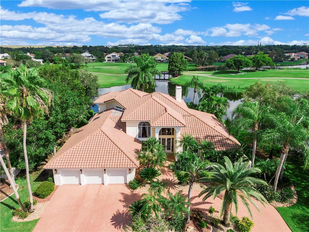 Spectacular 5 BR, 4 1/2 BA custom home on waterfront lot with panoramic golf course views. Rolling greens and flowing waterway provides million dollar views from living areas, pool/patio and 2nd floor balcony. Kitchen with granite counters and backsplash, wood cabinets and stainless steel appliances including built-in wall oven, microwave and dishwasher. Wood paneled sub zero refrigerator and cooktop island. Luxurious master suite with remodeled master bath. Spacious family room with custom entertainment center and wet-bar. Staircase to 2nd floor loft, 2 bedrooms and full bath. Newly renovated flagstone patio, tropical pool with raised waterfall spa and large screened lanai with incredible golf and water views. Huge circular driveway with 3-Car Garage. 3-zone A/C and central vacuum.