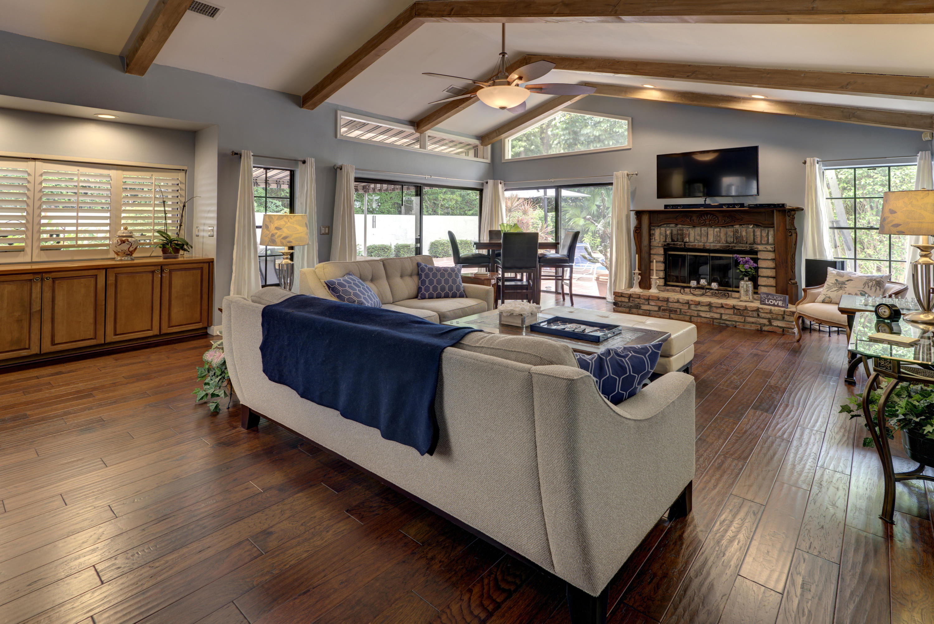 You Can Have it All; Style, Charm, Function, Privacy, Tranquility & Location with this Gorgeous Remodeled Home Ideally Located in the Heart of Boca Raton. The Home Has Been Updated from Floor to Ceiling with the Style & Charm You Find from Designers on HGTV. The Living Room Features Wide Open Views of the Private & Generous Patio Deck and Pool Area. Vaulted Wood Beamed Ceilings Offers a Spacious Feel w/ Plenty of Natural Light. The Dark Wood Floors & Real Wood Burning Brick Fireplace Help Add to the Warmth of the Room. The Kitchen is Exquisitely Redone in the French Contemporary Design. White Hardwood Cabinetry, a STUNNING Grey Granite Countertop, a Stainless Steel Farmers Sink, High End Stainless Steel Appliances, & a Decorative Tin Backsplash All Highlight the Form While the Function of